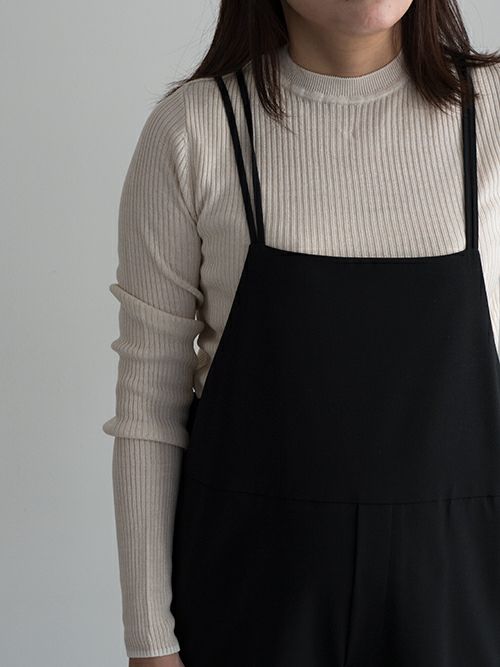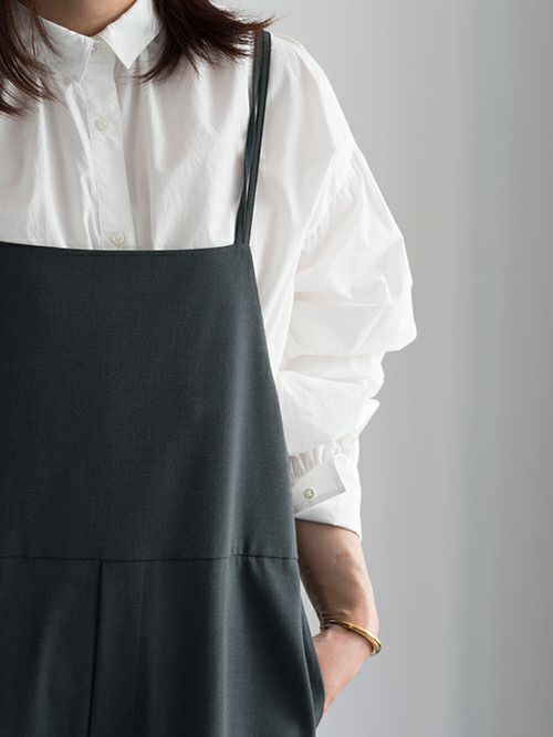 シンプルながらも美しい縦のラインを描き、大人の品を感じさせる一着に仕上げました。肩紐はさりげなく二重にデザインされ、甘くなりすぎず女性らしいニュアンスを演出。センタープレスが縦のラインを際立たせ、広がりやすいサロペット特有の印象をスッキリと引き締めてくれます。背中にはアジャスターを配し、着丈は好みに合わせて簡単に調整可能。トレンドに左右されず、洗練されたスタイルを楽しめる一着です。