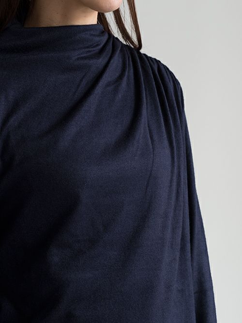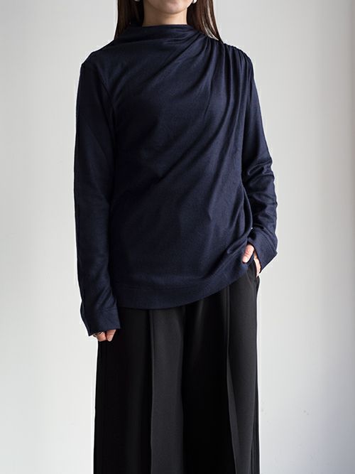 静かな個性が光る1枚ネックから肩にかけてアシンメトリーに寄せられた繊細なギャザーデザインが、柔らかな立体感を生み出します。片側に施されたボトルネックが、シンプルな中にモードなニュアンスを添えて。ハンドメイドならではの温かみと丁寧な仕立てが感じられる一着です。コットンとレーヨンをブレンドしたカットソー素材は、しっとりとした肌触りと程よい伸縮性で、快適な着心地を叶えます。日常に溶け込みながらも、さりげなくスタイルを引き立ててくれる、大人のためのベーシックアイテムです。