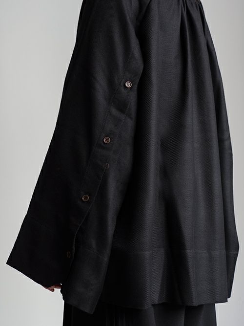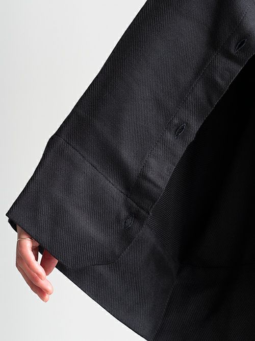 贅沢にたっぷりとシルクを使用し、ほどよい重みと上品な光沢が魅力です。袖後ろのカウスにはボタン開閉のデザインを施し、インナーを覗かせた着こなしも楽しめます。個性がありながらも、エレガントで洗練された印象に仕上がる一枚です。