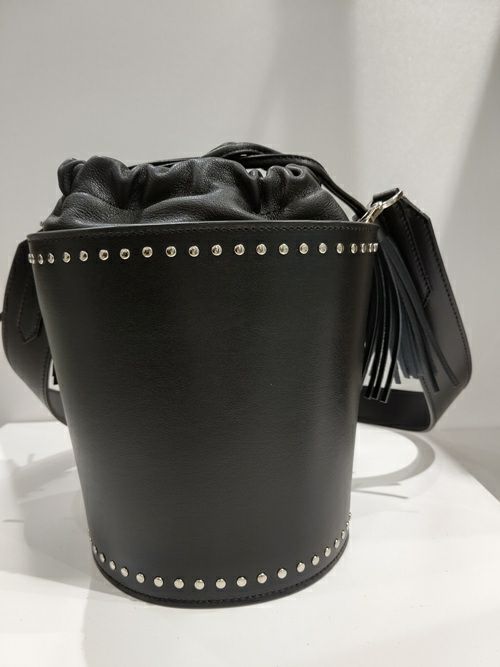 クリスチャンヴィラ定番のバケツ型ショルダーバッグです。自然なツヤ感のレザーはスタッズとの相性もバツグン。カジュアルスタイルに合わせるだけで少し洗練された印象に仕上がります。開閉は巾着タイプで、この巾着部分もレザーを使用しており、先端に付いたタッセルも立派なアクセントになります。