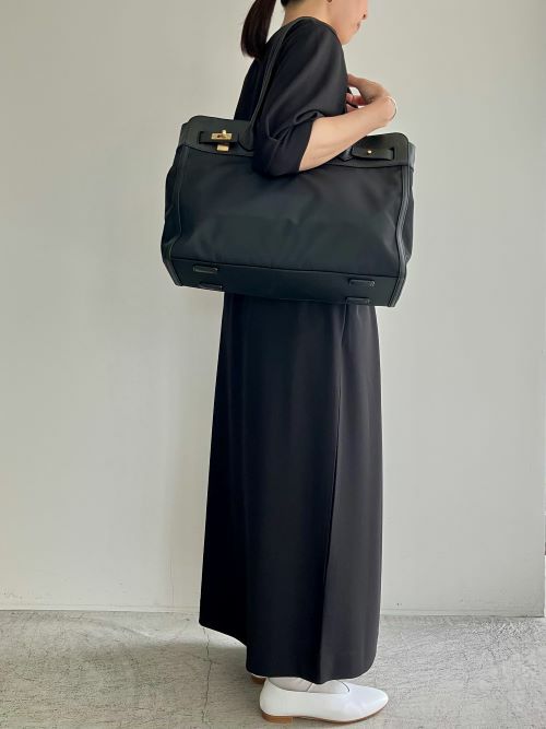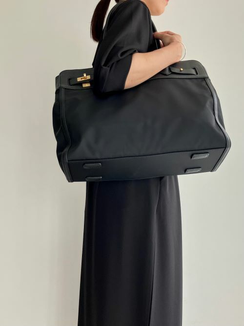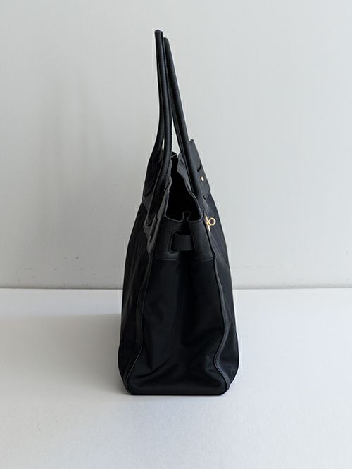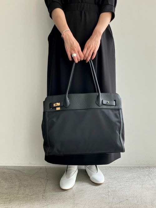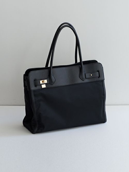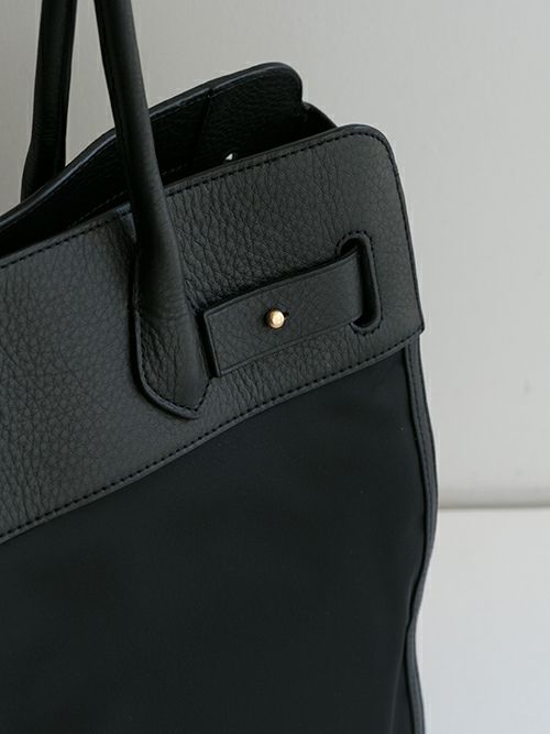 レザーとナイロンコンビのトートバック。オフィス仕様なデザインにナイロン生地を使用することで軽量になり、堅苦しくなく使用頂けるトートに。男性女性問わずお持ちいただける少し大きめで、肩にかけられる長さのハンドルにしており、小旅行にも最適な大きさです。両サイドのフロントのひねり、ギボシなどを外していただくと間口も広げることができます。季節は関係なく通年使用して頂けて、万能な使い心地です。