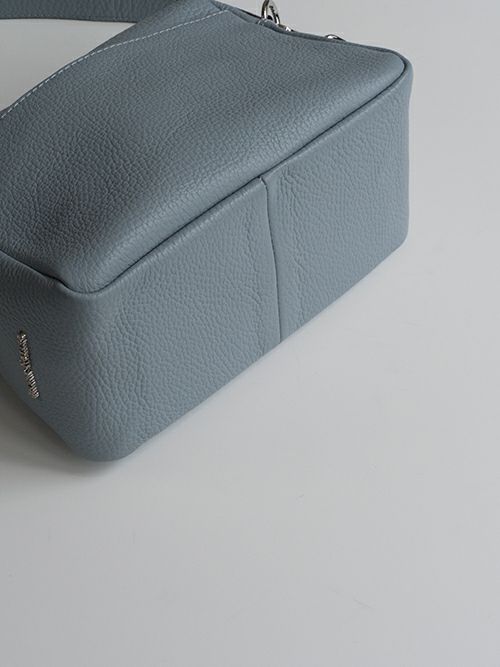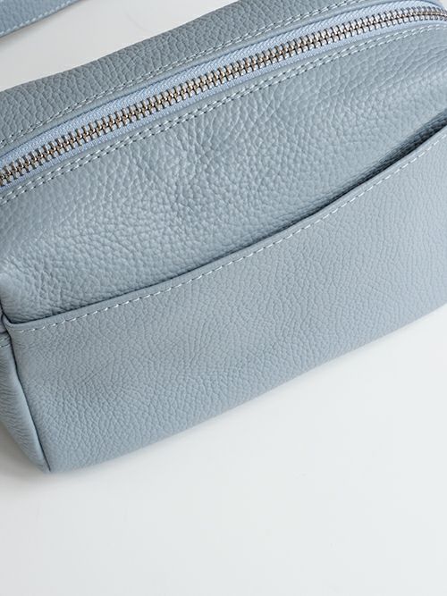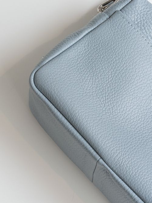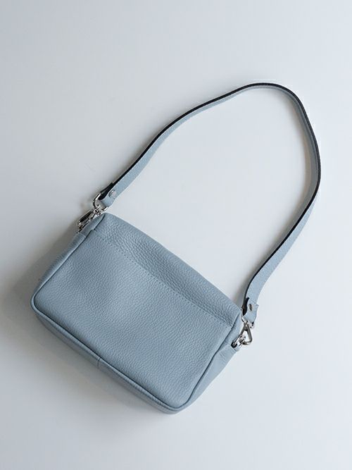アイスブルーが優しいニュアンスカラー。小ぶりのショルダー付きポーチ型バックでオンオフどちらも使いやすいです。