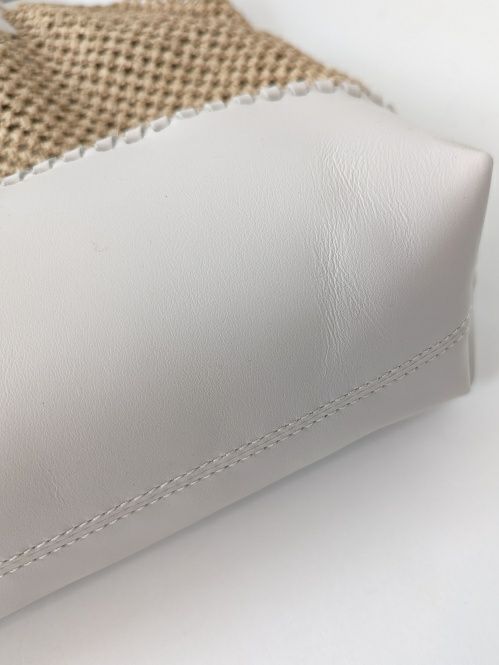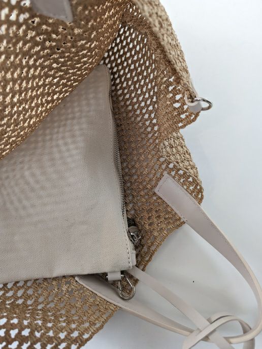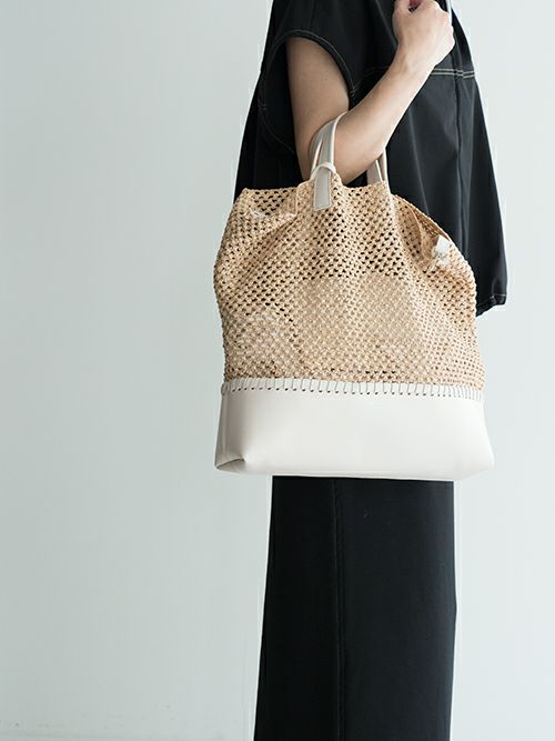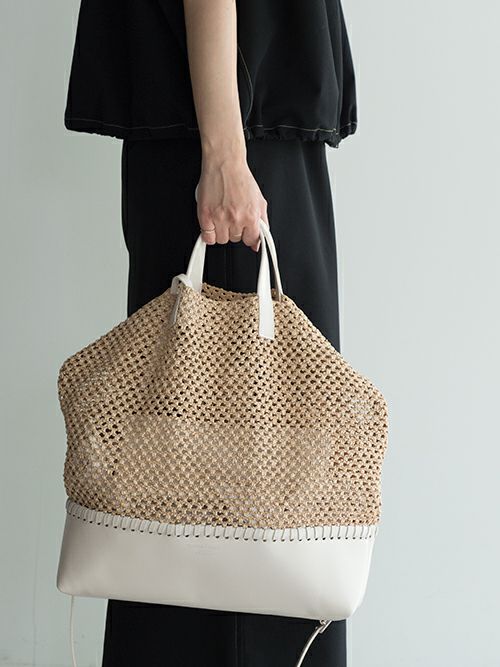 ラフィア素材の軽やかなカジュアルバッグ。持ち手をレザーにする事で、カジュアル過ぎず洗練された大人な印象になっています。着脱可能なレザーストラップで、コーディネートに合わせて持てるのも嬉しいポイント。付属にキャンバス地のポーチが付いており、取り外して単体でも使用できます。レザーとラフィア素材で春夏にぴったりのバッグです。