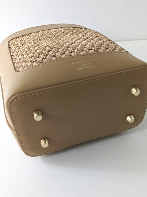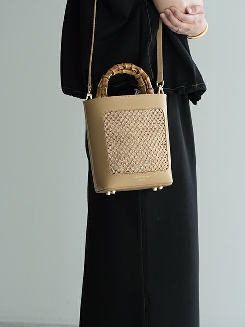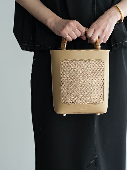 バンブー素材とラフィアのカジュアルな印象を、上質なレザーと組み合わせる事により、カジュアル過ぎず洗練された大人のバッグに格上げしています。着脱可能なレザーストラップが付いており、コーディネートに合わせて持てるのも嬉しいポイント。レザーとラフィア素材で春夏にぴったりのバッグです。