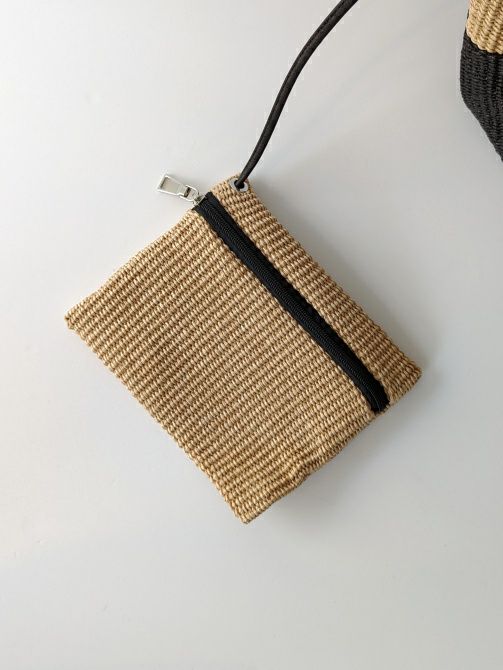 横長でツートンの立体的なカゴバック。ブラックが入ることでグッと引き締まる印象になります。間口が広くマチもある舟形タイプ。小さめポーチがついてきますので小物などを収納できます。