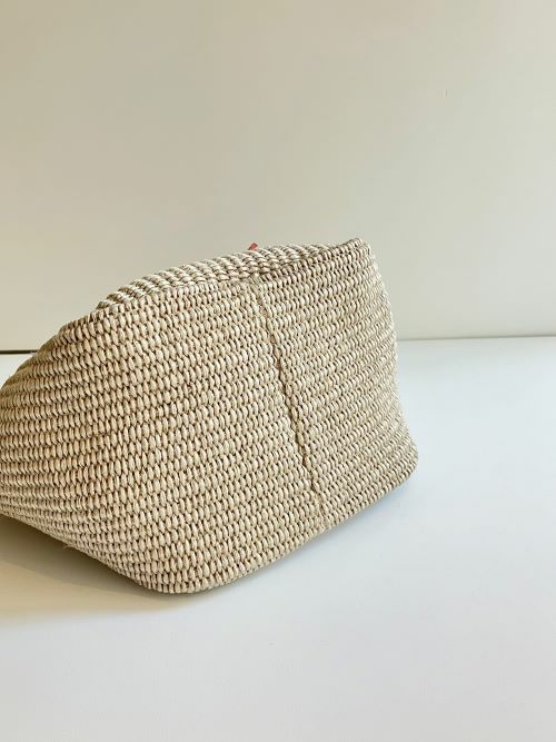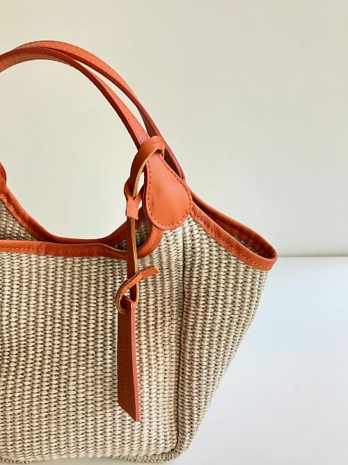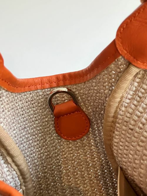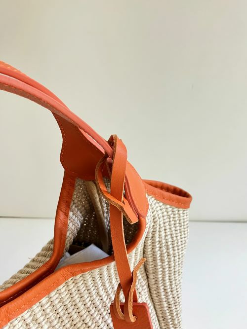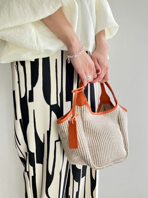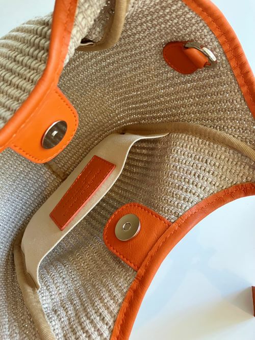 フチのオレンジのレザーがポイントで軽くてマグネット止めが付いています。すごく軽量で最小限の荷物を、収納するのに手軽な大きさです。ショルダーを斜めにかけられても肌当たりも柔らかいので、デイリーに使いやすいカゴバックです。