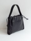 ワンショルダータイプの巾着のように絞ることができる変形可能なバッグ。最小限なマチでありながらギリギリA4サイズが入るぐらいの収納力です。勿論、B5サイズのノートは余裕で収納可能です。ちょっとした紙ものがあるときも便利です。カーフレザーで使用されいくにつれてより柔らかさがでてきます。シンプルで様々なコーディネートに合わせやすいバッグです。