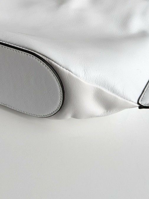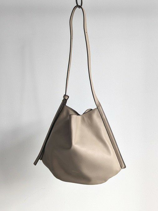華奢な細いハンドルと、口元を十字に留めた時の独特なフォルムのバランスが特徴。型崩れを防ぐよう、底は固い作りになっています。