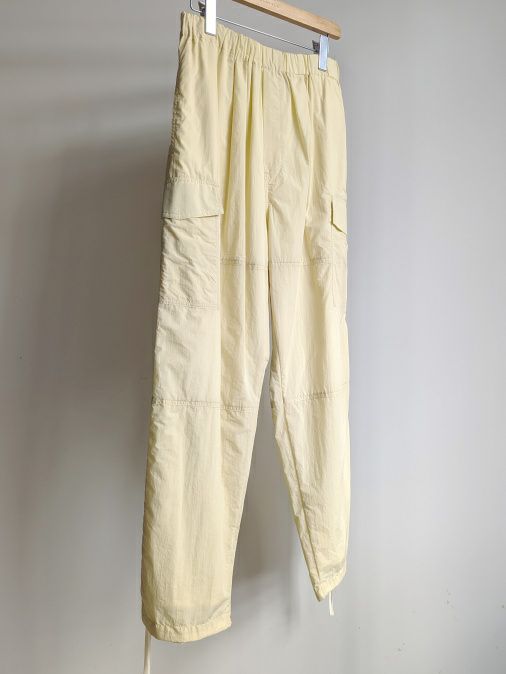 ヴィンテージのカーゴパンツをベースに現代的に再構築したデザインのパンツを薄手のナイロン生地で作りました。ミリタリーのアイテムと、薄くて軽くモードな素材とのMIX感もポイントです。ペーパーライクなタッチがシャリシャリと気持ちよく、奥行きのある独特な表情を醸し出し、モード感漂う表情豊かな心ときめく美しいアイテムになっています。原料にGRS認証を取得しているリサイクルナイロンを使用したサスティナブル商品です。仕上げにはフッ素フリーの撥水加工を施しており、弱撥水が謳えます。ご家庭で手洗い可能なイージーケアも嬉しいポイントです。