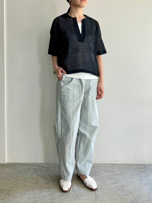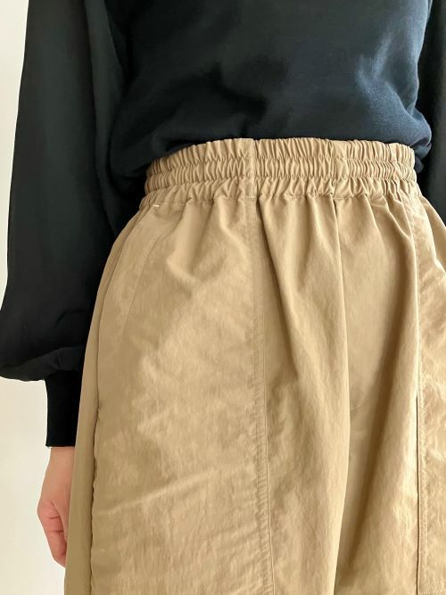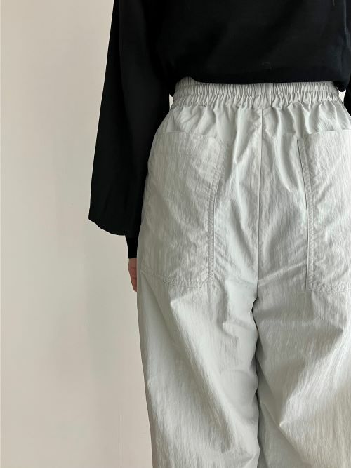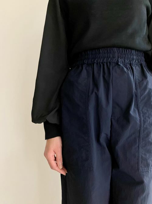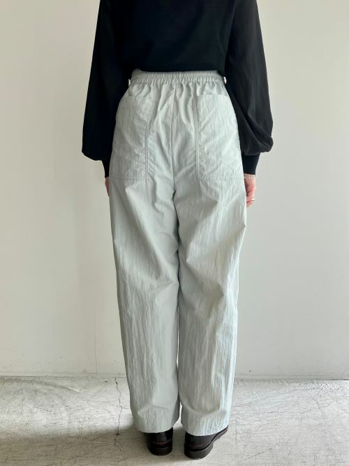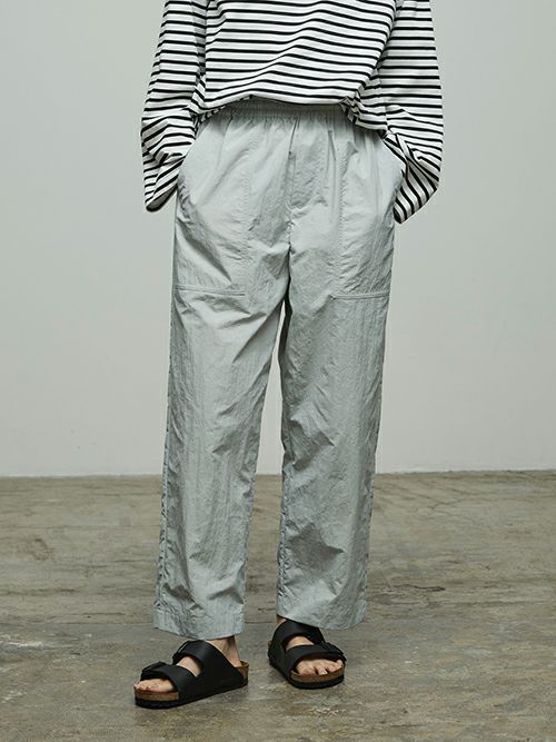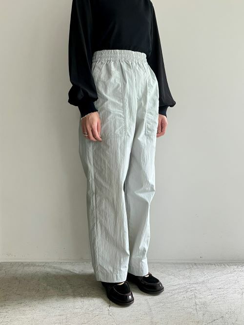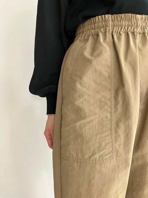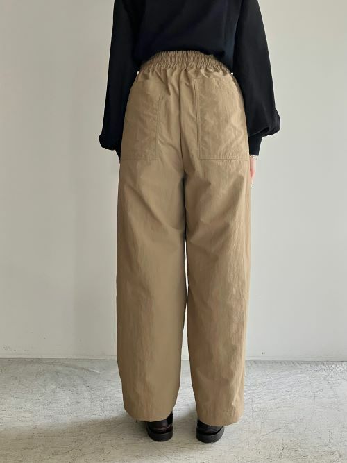 リラックスしたシルエットで大人の着こなしに馴染むよう仕上げました。ウエストはゴム仕様に加えフィット感を高めるドローストリング。素材はリサイクルナイロンを使用したナイロン100%素材。軽さと適度なハリ感が特徴で、天然繊維見えするマットな風合いが好バランスのエコ素材です。