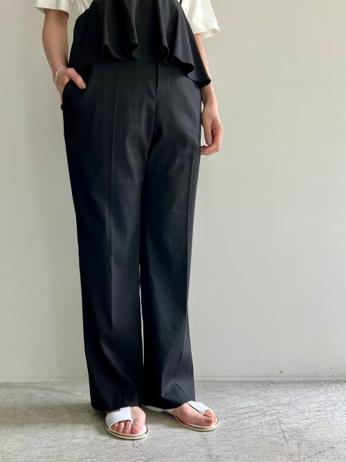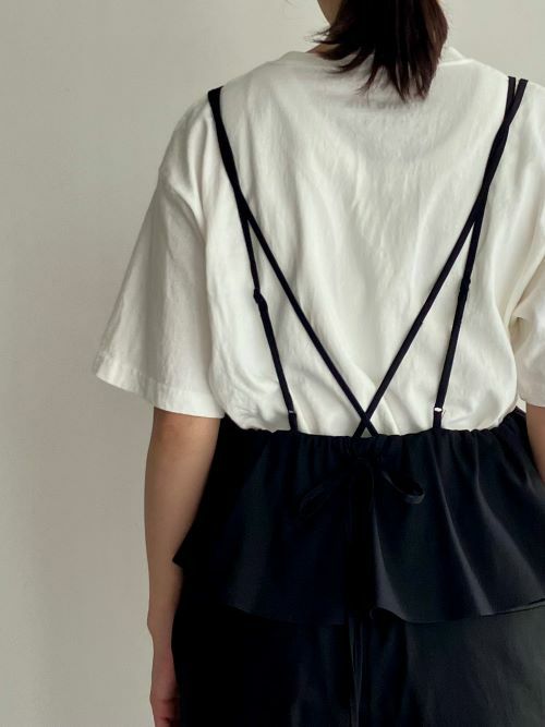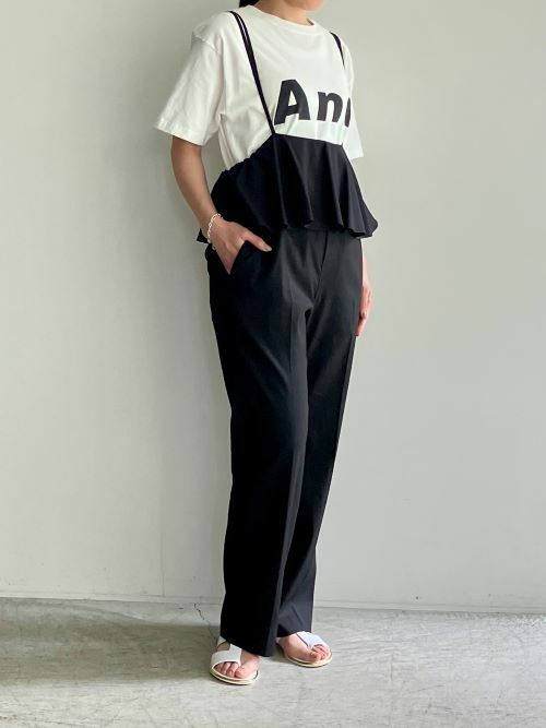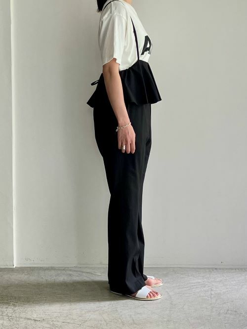 子供っぽくなりがちなサロペットを胸下のゆるやかなフリル使いで女性らしさを演出しています。細い肩紐はカジュアル感を主張せず、華奢で繊細な雰囲気が大人な可愛らしさを表現してくれます。センタープレス入りでジャケットなどのコーディネートでキレイ目なスタイリングもお薦めです。