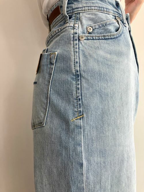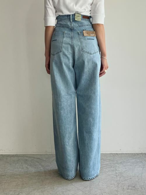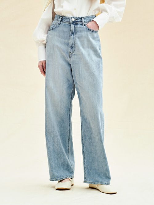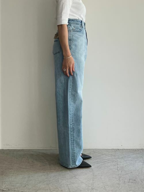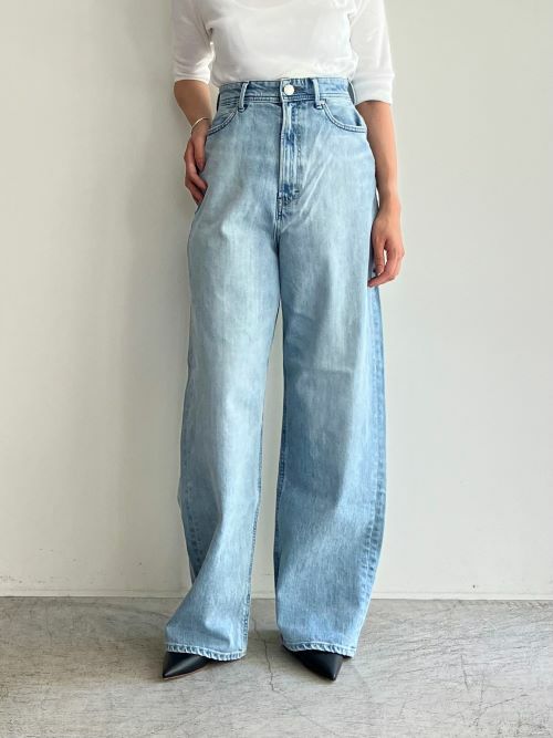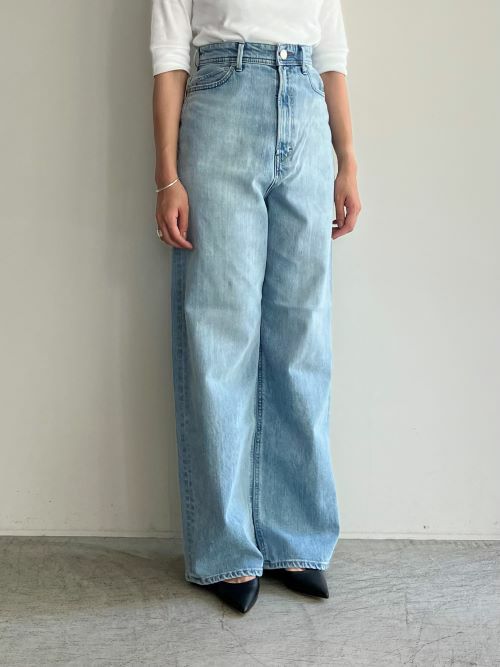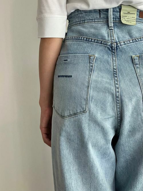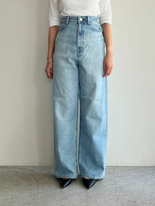太腿から裾にかけて太いストレートシルエットのJOAN。メンズの太めジーンズを女性が履きこなすイメージです。ボリュームのあるパンツですが、ウエストがタイトで細く、華奢に見せてくれます。