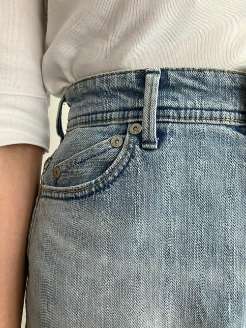 長年穿いた古着顔を最新技術で再現。従来のジーンズ加工には、たくさんの水・薬剤が使用されています。今回のアイテムでは、YANUK自社工場で新たに導入された、ナノミストを発生させる加工機を使用しています。それによって、水・薬剤を大幅に削減できています。全体的にしっかりついたあたりと色落ち加減が絶妙な1本で、ヒゲが入ることにより腰回りの間延び感を軽減。色は、穿きやすい明るめの中間色です。モモのハイライトも本格的な表情にするため、レーザー加工で入れています。表情と穿きやすさのギャップに驚く1本です。
