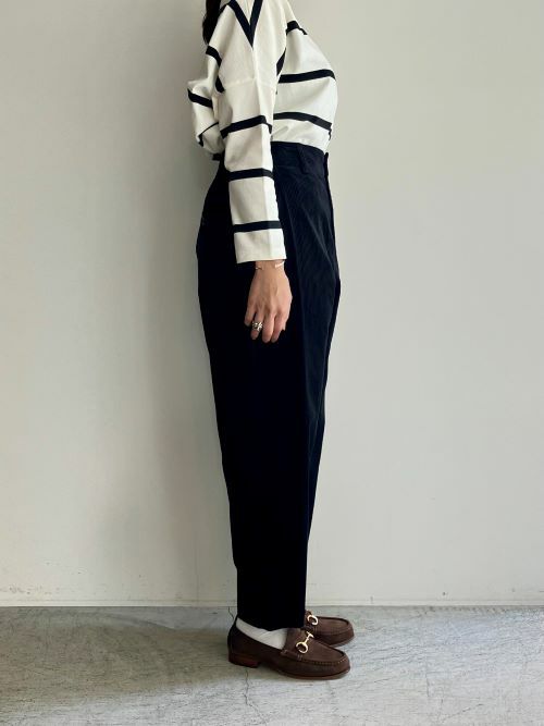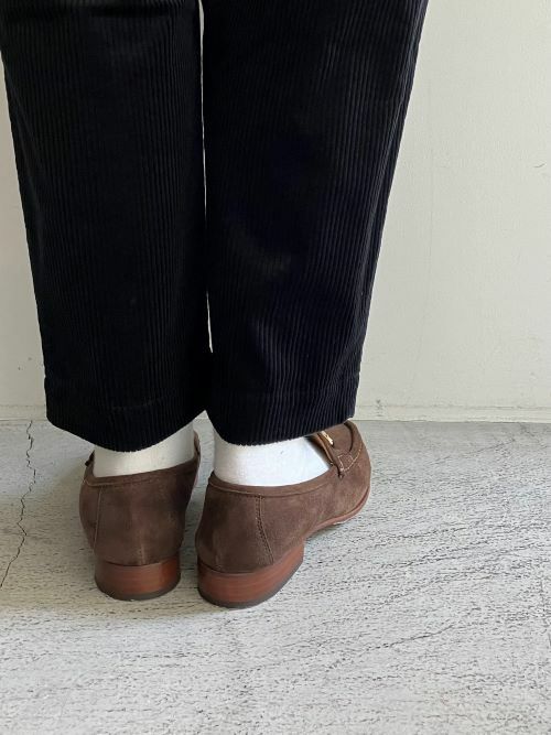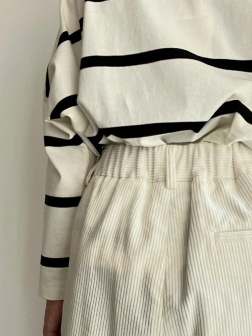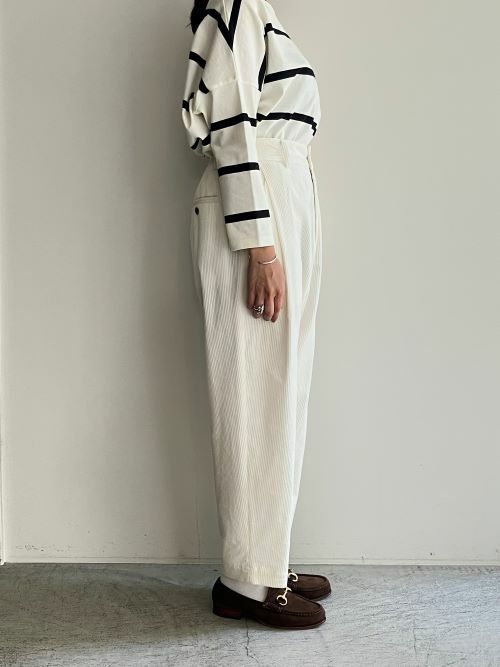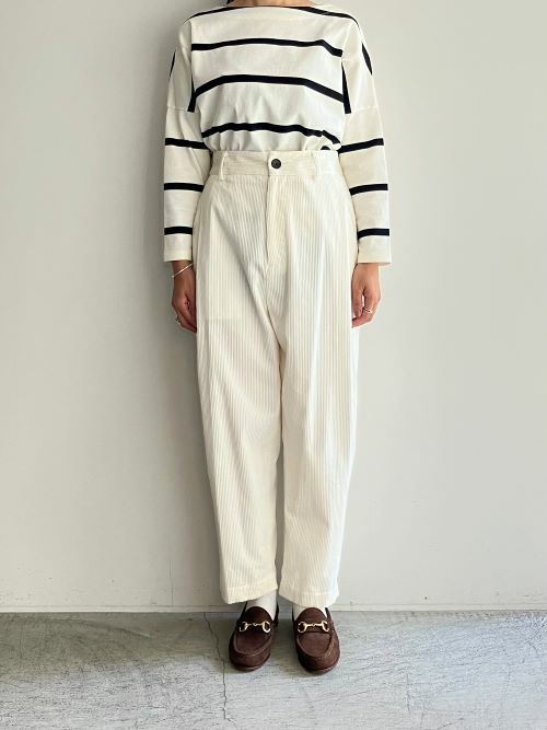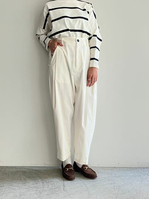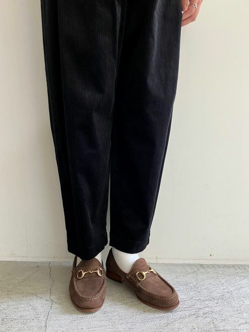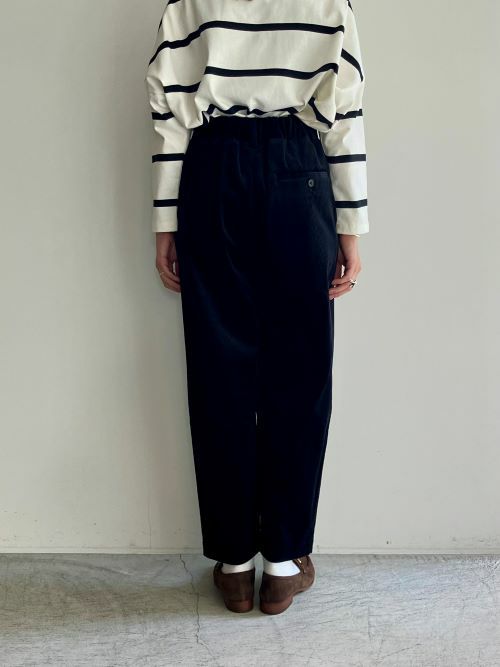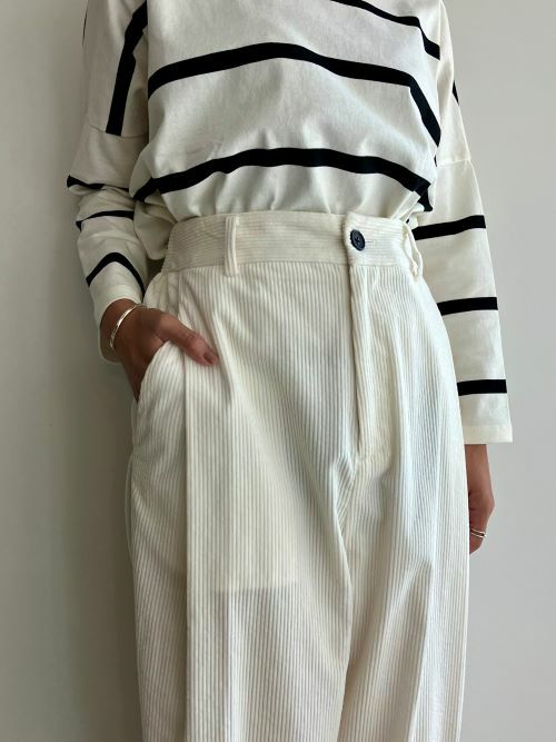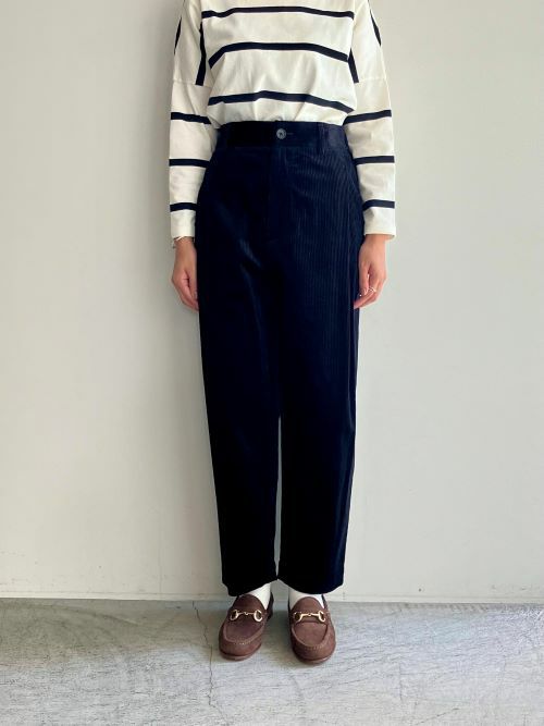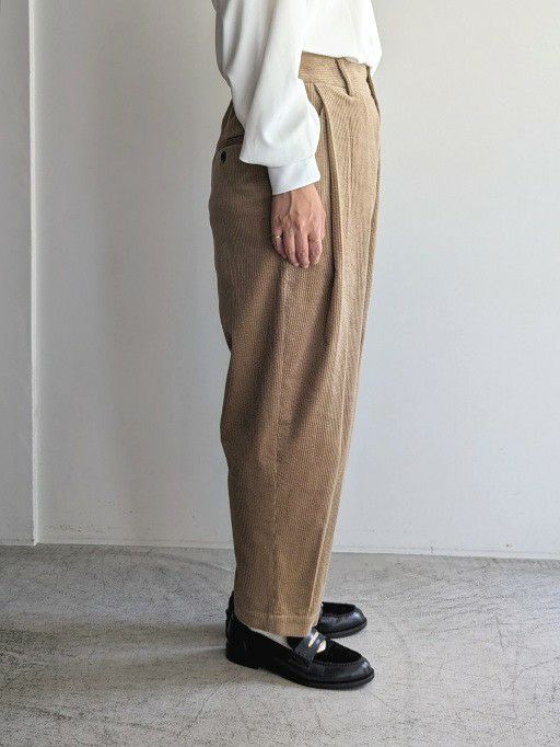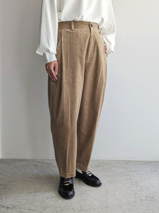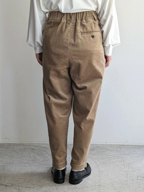 サイドに深めのタックを施したテーパードシルエットが特徴。腰回りにゆとりをもたせつつ、シームポケット仕様に。きちんと見える釦仕様のフロントにバックウエストゴムで履き心地にも拘りました。 光沢感のあるクラッシックなムード漂うコーデュロイを使用。しなやかさと軽さが特徴の新コーデュロイ素材。