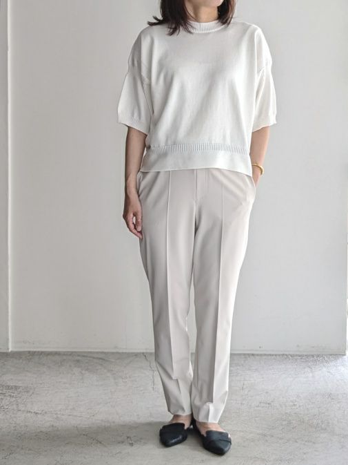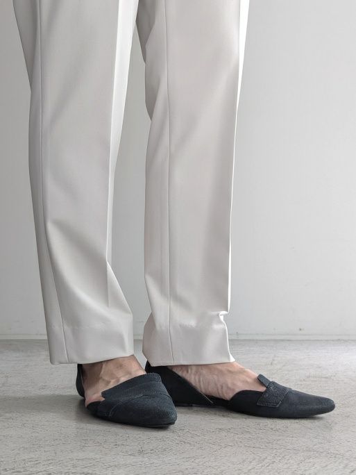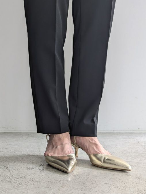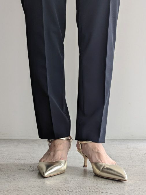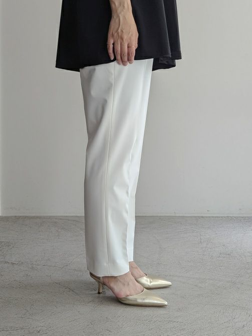 ヒップ下から膝上までに僅かなゆとりを持たせ、膝から裾にかけてすっきりとしたストレートラインに仕上げられたシルエットは、細見え&脚長効果があります。