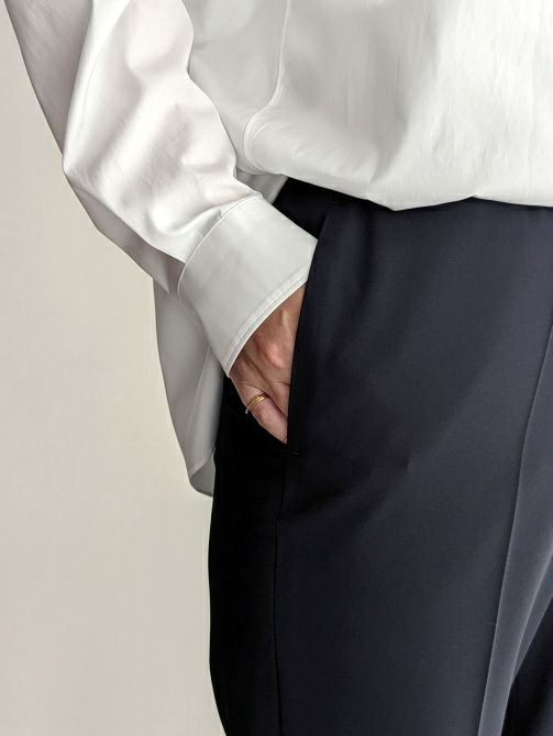テーパードの効いたすっきりとしたシルエットが魅力。Aラインのブラウスや女性らしいシャツと合わせれば、上品でトラッドな着こなしが楽しめます。