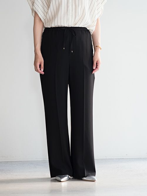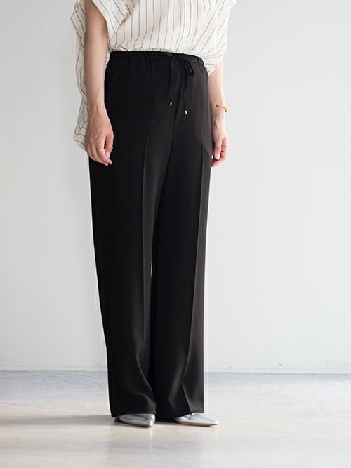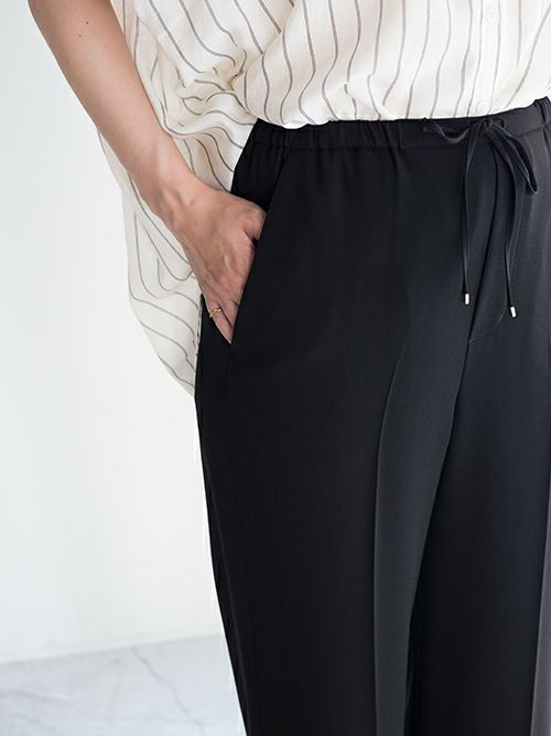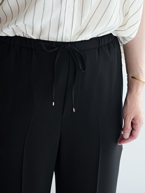 美しい光沢と、しなやかな風合いを併せ持つ素材を使用。上品な落ち感と程よい重みが、動きにエレガンスを添えます。ウエストは細身のゴムとドローコードで仕上げ、リラックス感のあるはき心地に。カジュアルな仕様ながらも、センタープレスが全体を引き締め、洗練された印象を演出してくれます。