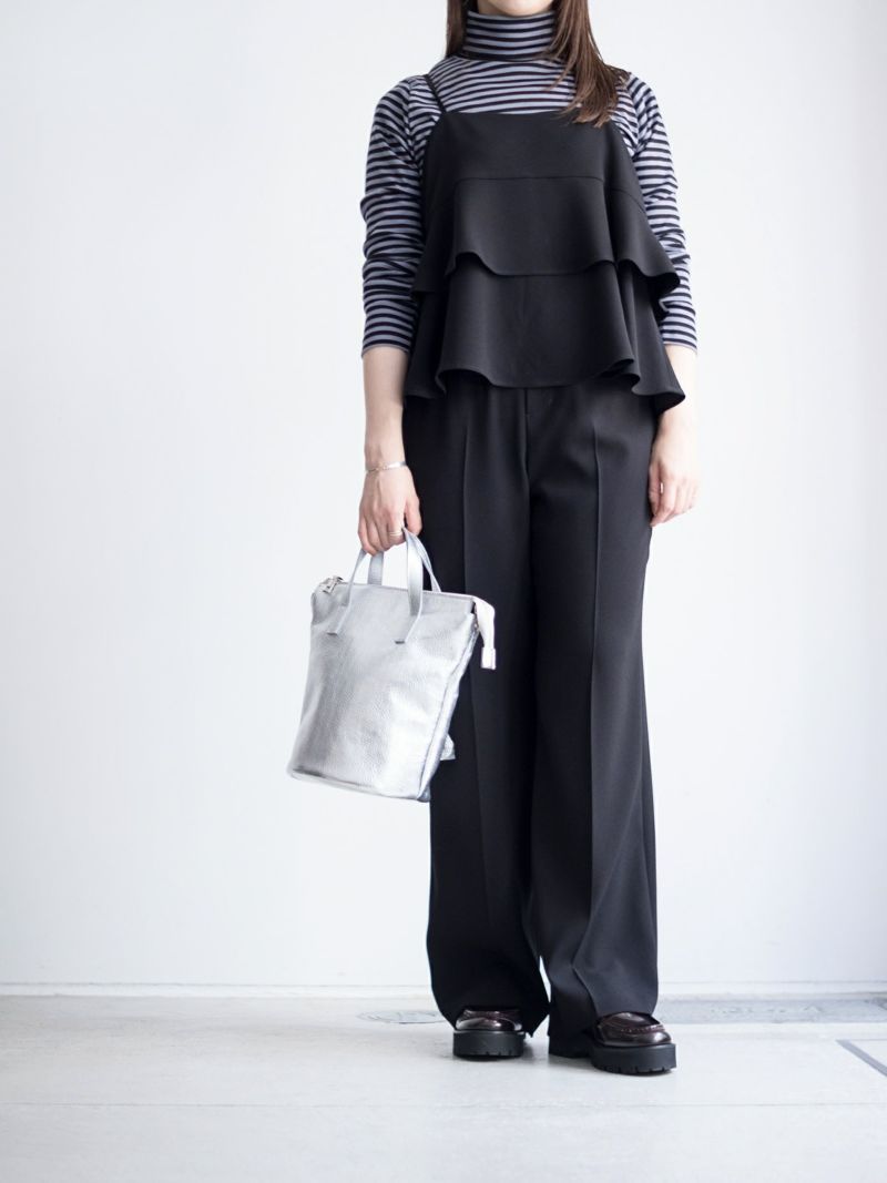 子供っぽくなりがちなサロペットを胸下のゆるやかなフリル使いで女性らしさを演出しています。細い肩紐はカジュアル感を主張せず、華奢で繊細な雰囲気が大人な可愛らしさを表現してくれます。センタープレス入りでジャケットなどのコーディネートでキレイ目なスタイリングもお薦めです。