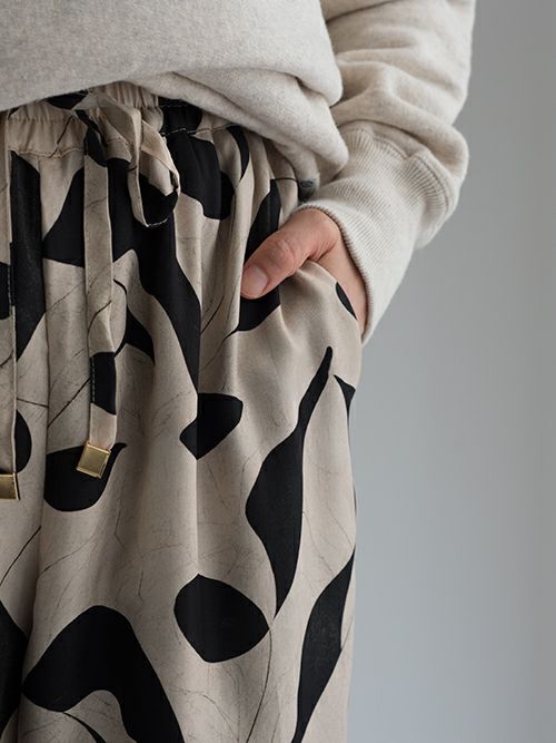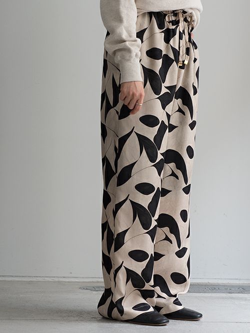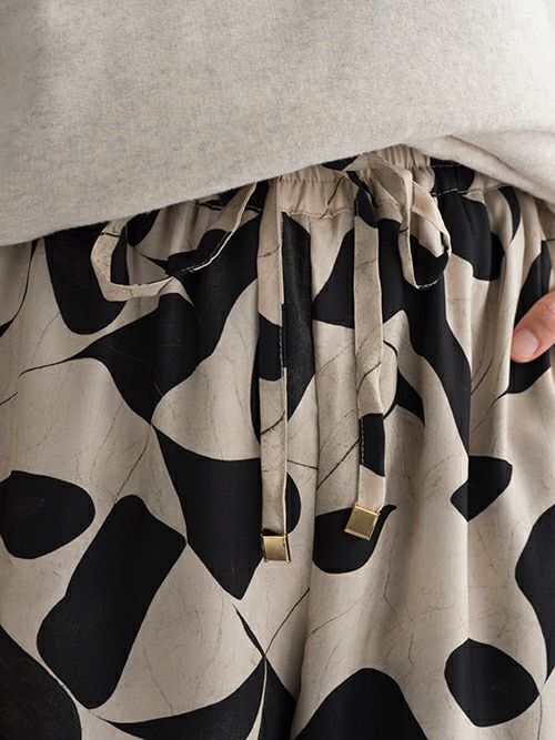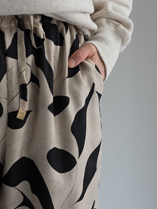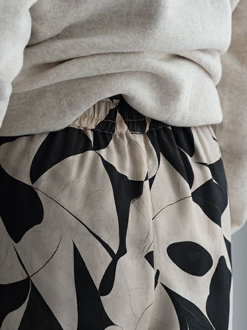 印象的なリーフモチーフの総柄プリントが着こなしにモダンなアクセントをプラス。ウエストは総ゴム&ドローコード付きで、リラックス感のあるイージーなはき心地。膝丈までの裏地付きで安心感もプラス。ゆとりのあるシルエットと、自然に落ちる柔らかな生地が美しいドレープを演出。上品な光沢感とシワになりにくい素材も魅力です。