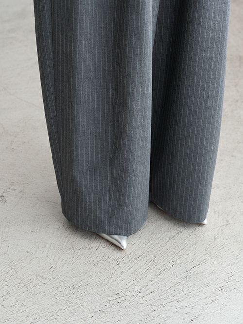 ゆったりとしたシルエットのワイドパンツです。ウエストはゴムになっており、リラックスして着用できるイージーパンツタイプです。生地にはピンストライプがあしらわれており、カジュアルになりすぎず、きれいめな印象を与えます。