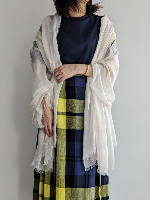 適度なボリューム感で巻きやすく、マフラーのようにぐるっと巻いたり、肩から掛けたりと様々なアレンジを楽しんで頂け、ジャケットやカットソーともよく合います
