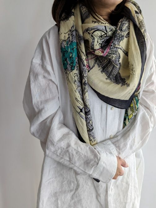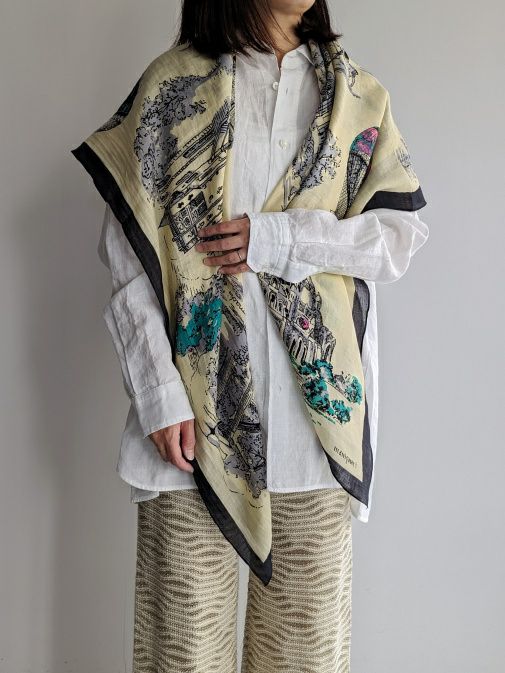 ヴィンテージスカーフからインスピレーションを得てつくられるスカーフは、素材やサイズにもこだわりを持ち、どんな巻き方でも美しく見えるよう計算されています。