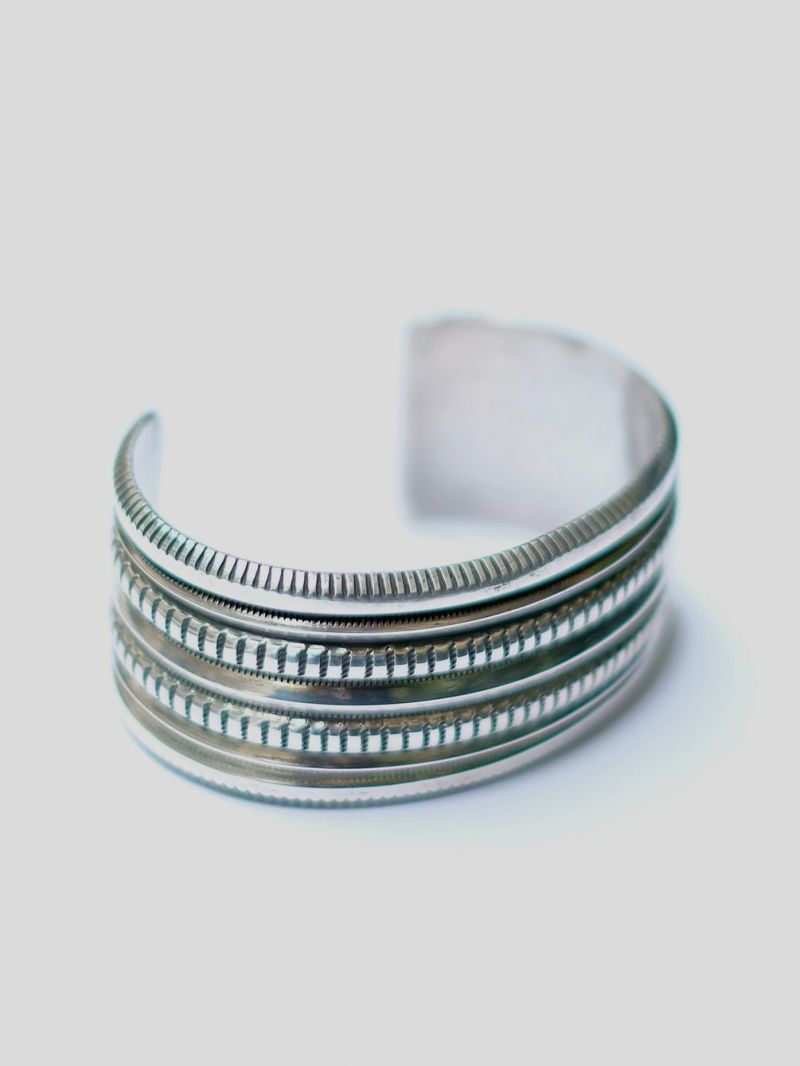 NAVAJO(ナバホ)族は、アメリカ南西部付近のネイティブアメリカン(先住インディアン)で、NAVAJOは「涸れ谷の耕作地」という意味を持ちます。 インディアンジュエリーは、そういった、ネイティブアメリカの19の部族から作られる装飾品を指し、その中でも特に インディアンジュエリーの代名詞的部族の1つであり、ひと括りには出来ず、アーティストによって大きく作風も異なります。こちらのバングルは幅もあり、デザインに立体感がありますので、単品使いがおすすめです。