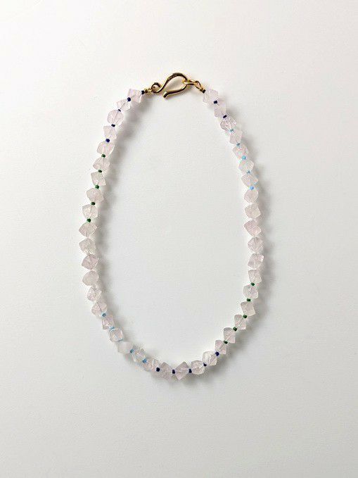 ローズクォーツネックレス。立体的にカッティングされたローズクォーツの間にビーズをあしらったデザインは、上品さと華やかさを兼ね備えています。