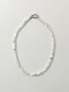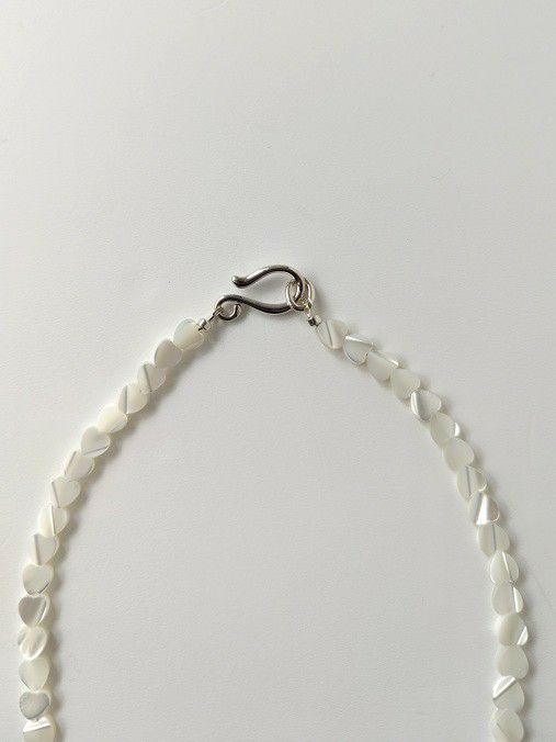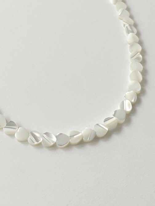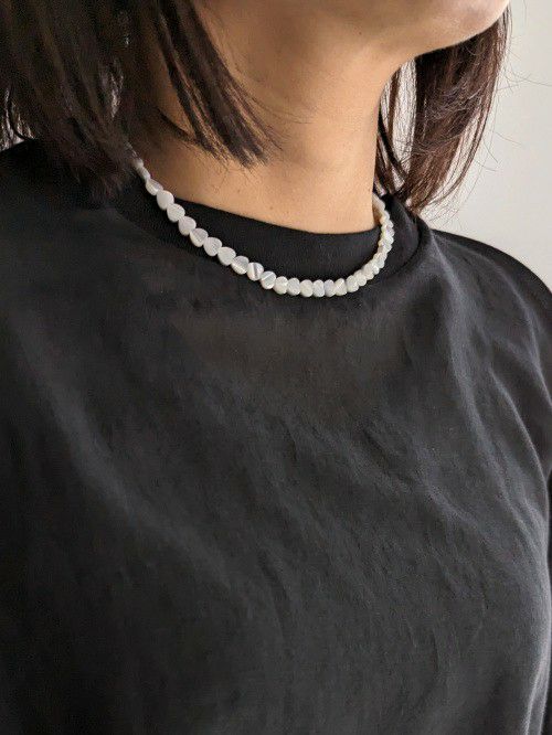 マザーオブパールを美しく加工したネックレスは、光の角度によって微妙に色合いが変化し、ニュアンス豊かな首元を演出します。上品でありながらキュートなデザインカットがポイント。