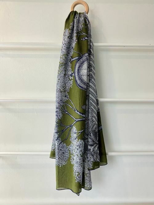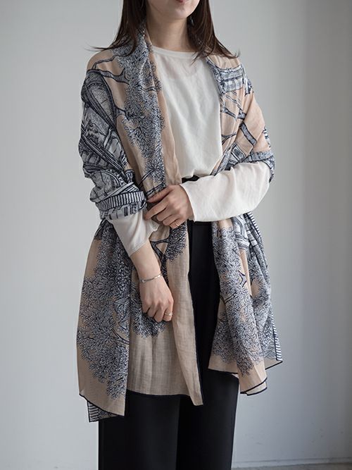 蜃気楼に浮かび上がる宮殿のような建物が描かれた、シックで大人な印象のスカーフ。カラーを抑えた絵画のようなデザインで、様々なスタイルにも馴染む一枚です。