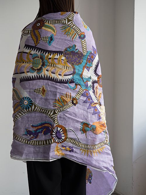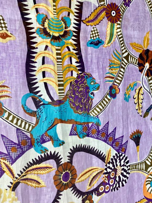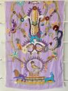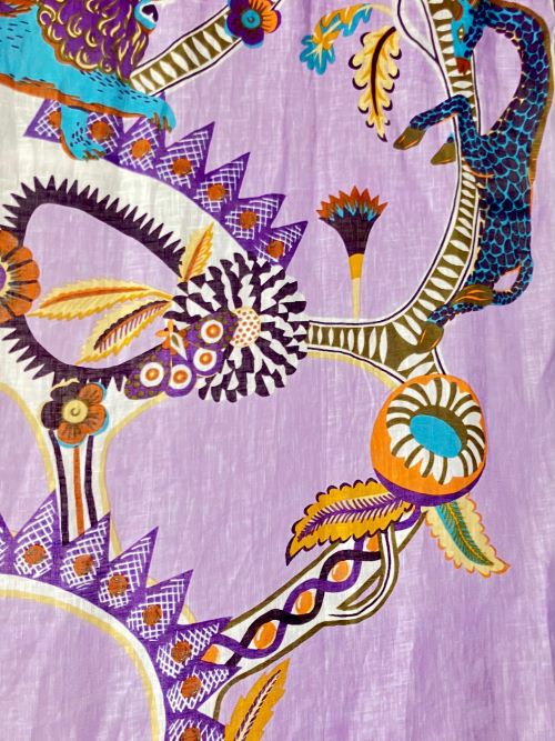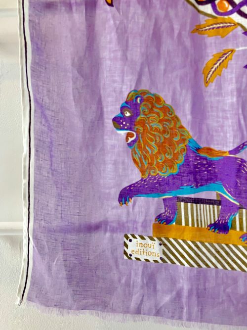 島やシマウマ、魚などが描かれた上品なアニマルデザインのスカーフ。エキゾチックな雰囲気ながらシックなカラーリングで、様々なスタイルに馴染む魅力的な一枚です。