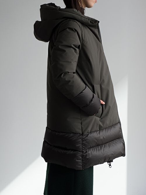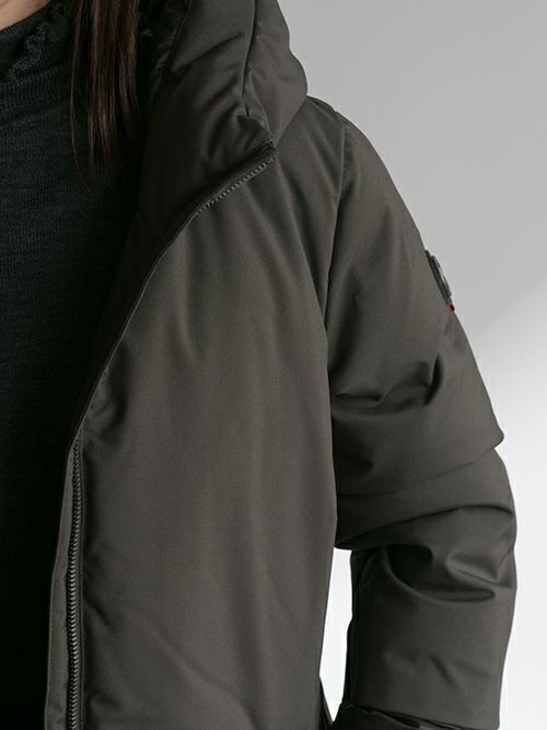 強度と耐久性に優れた100%ポリエステル素材を使用しており、防水性、耐風性、透湿性の機能性を備えた1着。すっきりとしたAラインのシルエットが女性らしく、カジュアルからキレイめまで幅広いシーンで活躍します。