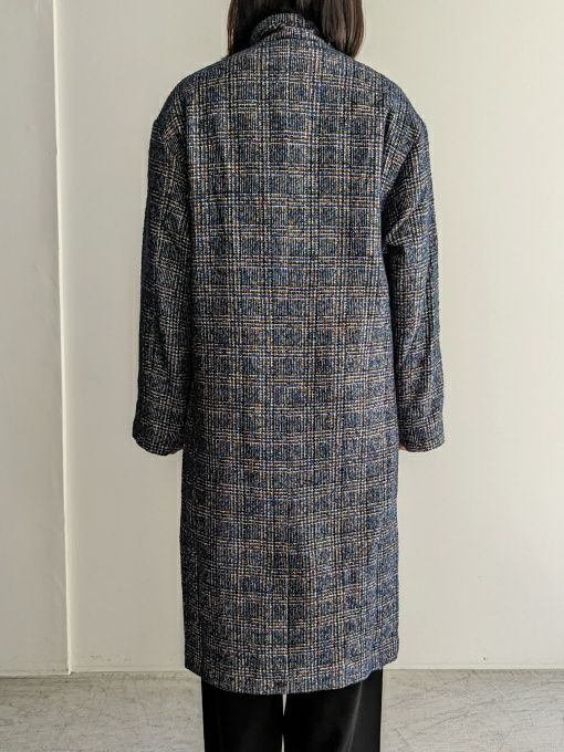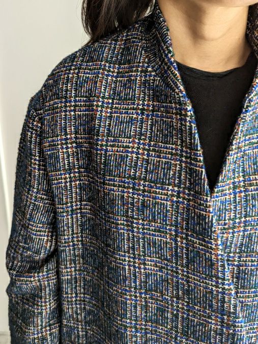 打合せ浅めのダブルで、シンプルなデザインに明るいカラーをちりばめたチェックが一際目を惹くファブリックが愛らしいです。裏地はグリーンストライプで、敢えて袖を折り返して見せたくなるのもポイント。