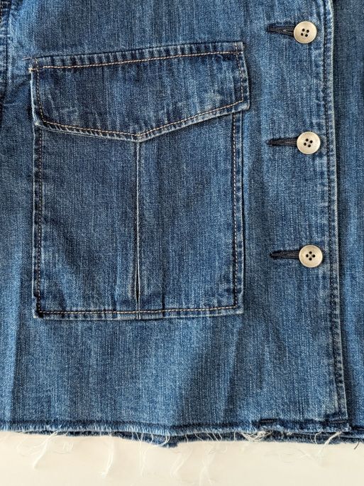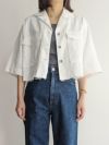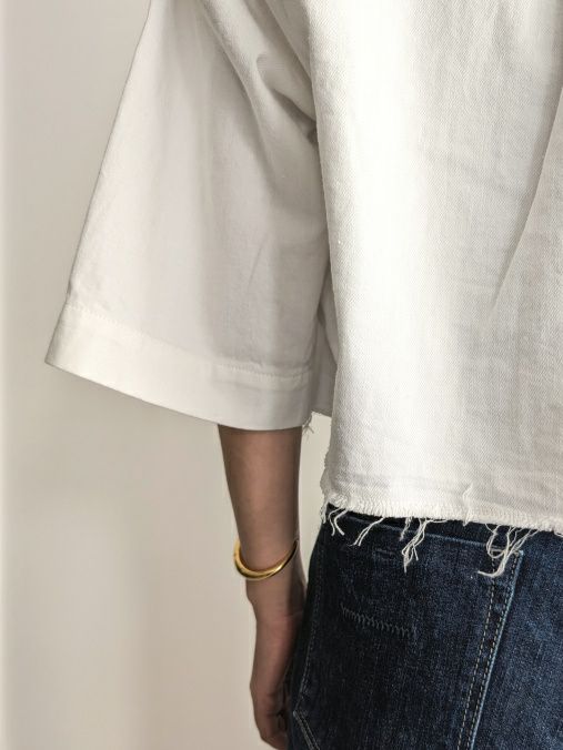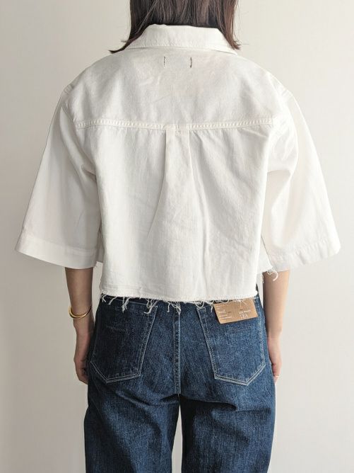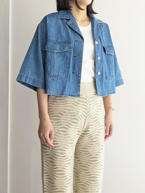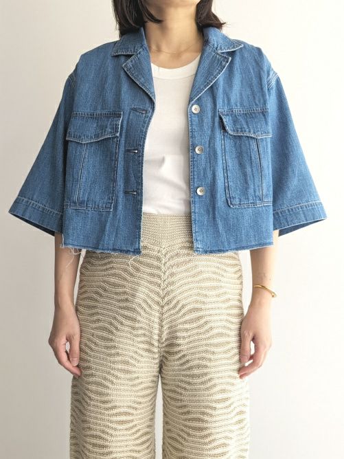 トレンド感のあるクロップド丈に仕上げたオープンカラーデニムシャツ。綿麻生地の軽やかな着用感と、スタイリングのポイントとなる裾のカットオフが魅力的な一着です。