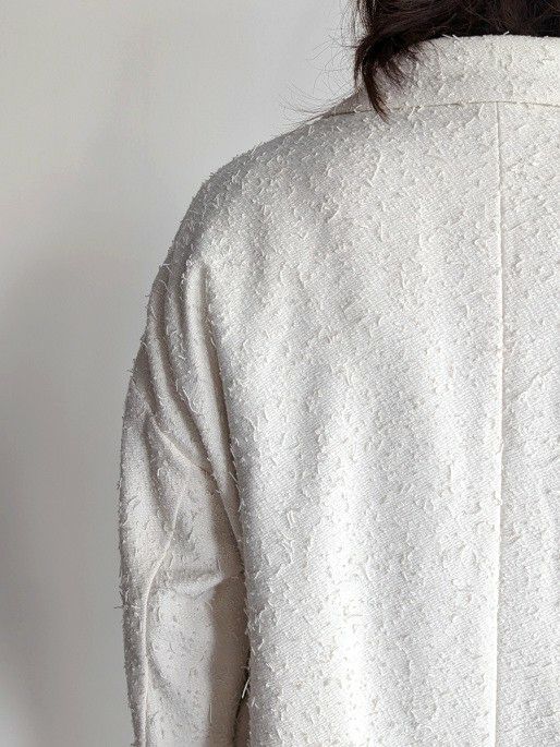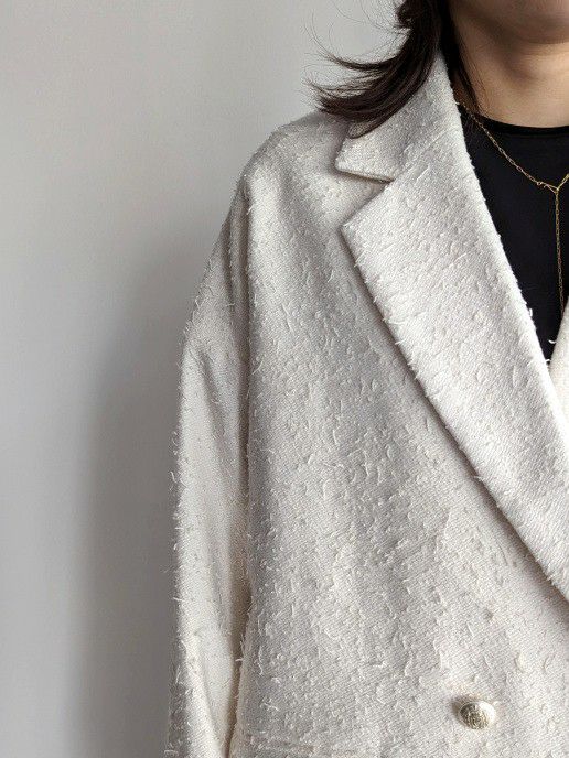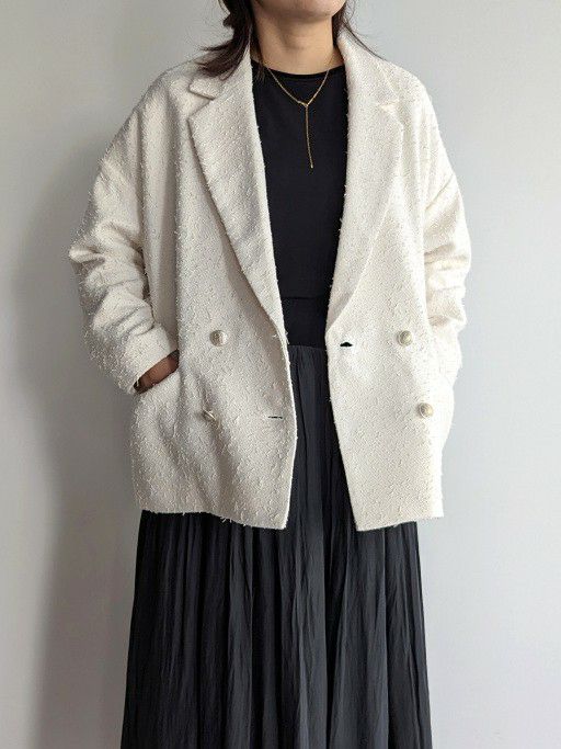 コットンの織生地にネップなどをあえて出したニュアンス生地が特徴のダブルジャケット。オーバーサイズのシルエットですが袖、着丈などはコンパクトにしてバランスのとりやすいフォルムにしています。中は総裏地でニット着用も可能で、軽いアウター感覚使いも出来ます。