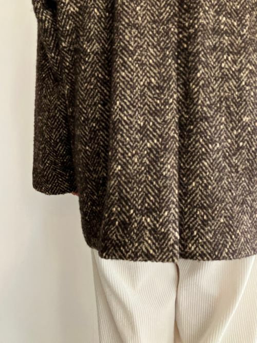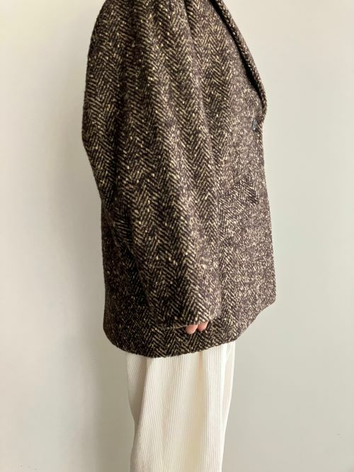 素材は奥行きのある表情と、クラシカルな雰囲気に上品な色気漂う MIX ツイードのヘリンボーンです。タテ糸、ヨコ糸ともに形状 の変わった特殊な糸を使用することによってランダム性のある表情をしています。特にタテ糸のベージュは 2 種類の糸の形状を使 用してベージュの色目も若干変えてあり、表現に深みを出しています。その為、一見普通のヘリンボンでもループ糸やスラブ糸が見え隠れして独特な表情やタッチを感じられることができます。