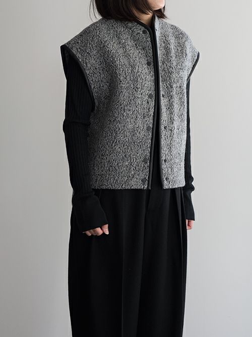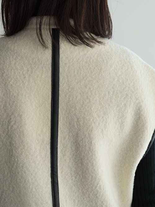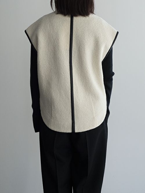 フェイクレザーパイピングで縁取ったシンプルなショートベストは、カットソーにオンする秋口のプラスワンアイテムになります。冬にはアウターのインナーとしての着用もお薦め。