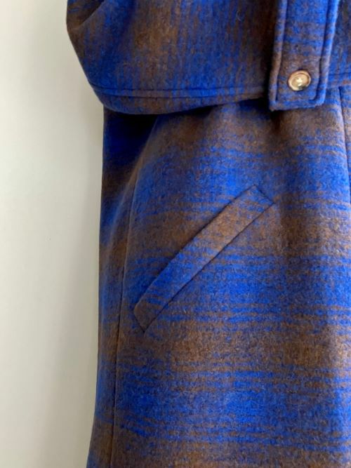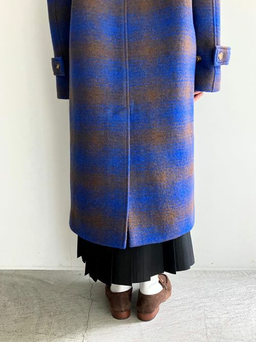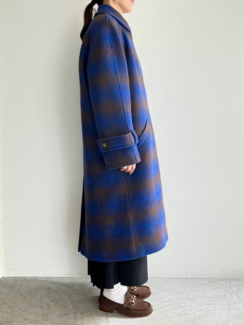 ラグランスリーブにステンカラー、フロント比翼タイプでシンプルなデザインです。明るめのブルーチェックが一際目を惹くファブリックが愛らしいです。見た目の肉厚さよりも軽くて裏地もついていますのでさらりと羽織りやすいので軽快に着用できます。