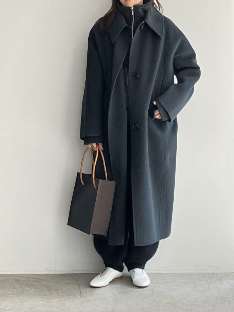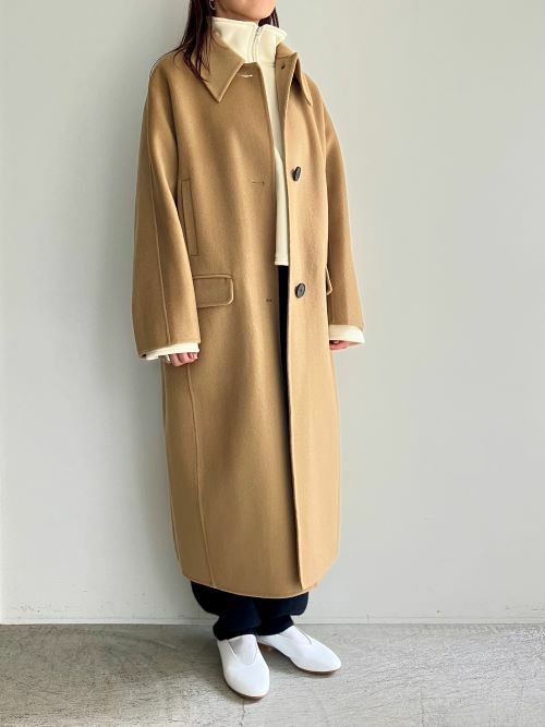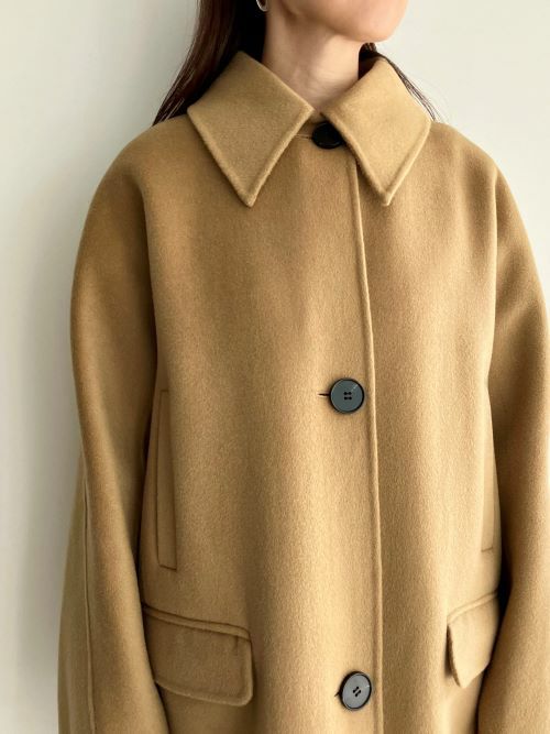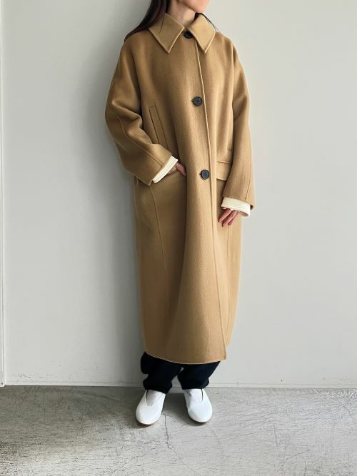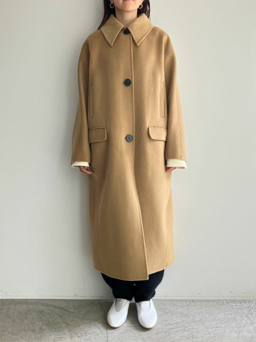 ドイツの新素材ドラロンという、保湿性と鮮やかな発色性に優れたアクリル混紡資材も含まれている上質素材をセレクトしています。80年代のステンカラーコートをベースに、女性らしく少し丸みのあるコクーンシルエットにアップデート。サイドに切り替えを入れ、ボディのシルエットに拘った一枚。アームの切り替えを変形させ、着心地にも配慮しています。クラシックでレトロな雰囲気をを持ちながら、全体のシルエットが現代的なコートに仕上げています。