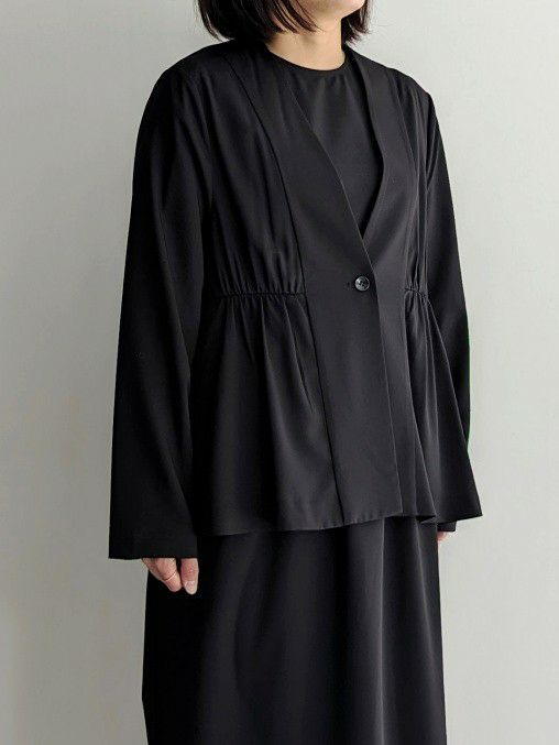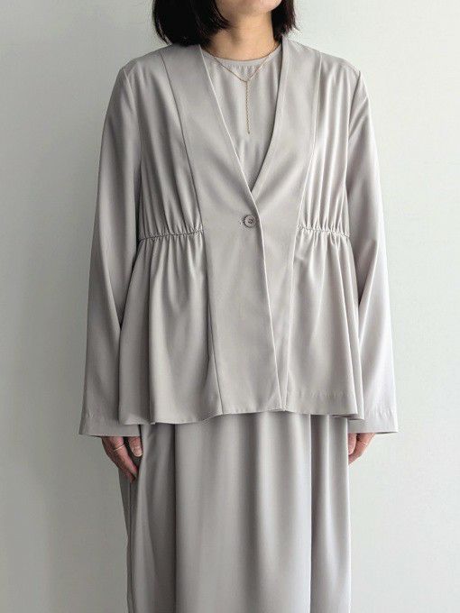 きちんと感も残しつつ、ウエストギャザーが女性らしい柔らかな印象。カーディガンのように軽く羽織れる手軽さも魅力的な一着です。