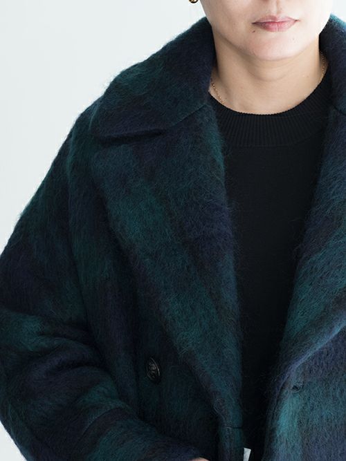 重厚なブラックウォッチの品格と、糸自体の華やかさと上品さが特徴のシャギーチェックです。 横に1/3番の糸を使用するので太番手になるからふくらみ感が特徴です。 またモヘアが高混率でしっかりと入っていることでモヘア特有の上品な光沢感と艶感、しなやかな反発性がいきます。 しっかりとしっかりみがありながらしっかりなりすぎずよりふくらみ感があり、唯一無二の仕上がりが魅力の生地です。形はTICCAの代表的なアイテムであり、多くの方に愛されているテントコート。 アームホールのハギをなくして贅沢に身頃を一枚で着ることで、肩幅の狭い人や大きい人にも対応できます。 痩せてる方にもぽっちゃりさんにも、小さい方にも大きい方にも似合うゆったりとしたジャストなシルエットに仕上げました。 袖も折って調整できるようにカフス仕様になっています。