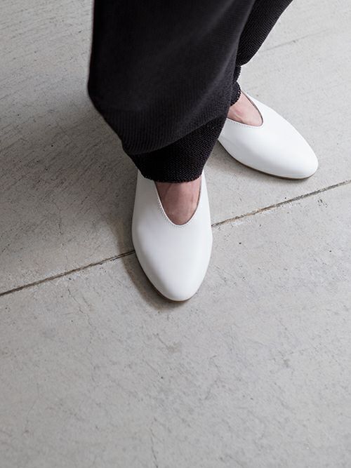 すっきり見えるミニマムな印象が魅力的なローヒールパンプス。使用されているレザーはしなやかで足馴染みが良く、快適な履き心地の一足です。