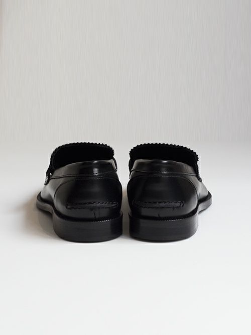 アッパーに表革とハラコのコンビで仕上げる事で新鮮な佇まいのコインローファー。ラウンド型の金具も特別感を演出するアクセントになっています。