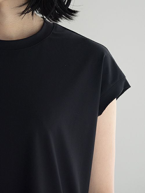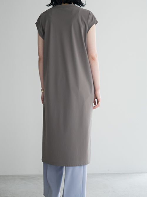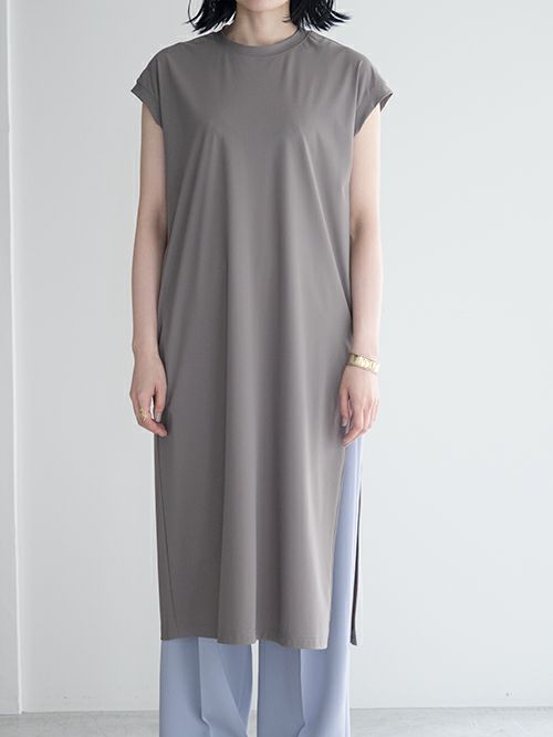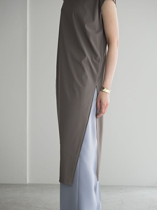 ストレッチ素材でさらりとした着心地のワンピース。片側には深くスリットが入り、パンツやロングスカートなどとのコーディネートを幅広く楽しめる一着。
