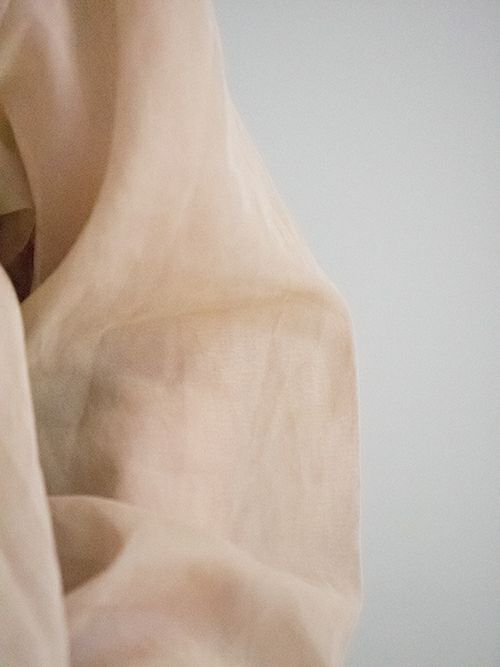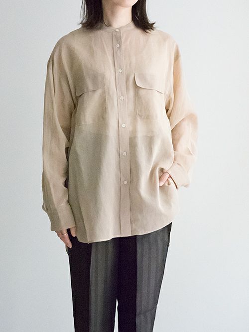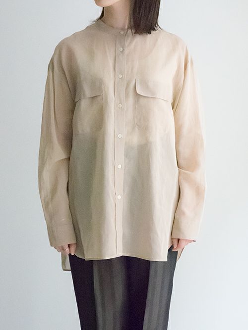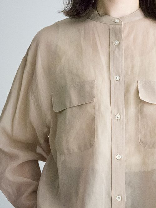 ハリがあり上品な透け感のコットンオーガンジーの生地を使用したスタンドカラーシャツ。