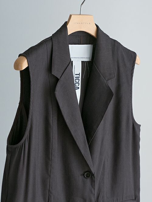 春夏の定番生地であるリネン混のジレ。ブラウスやカットソーの上にさらりと羽織れて、オンオフ共に使用できます。