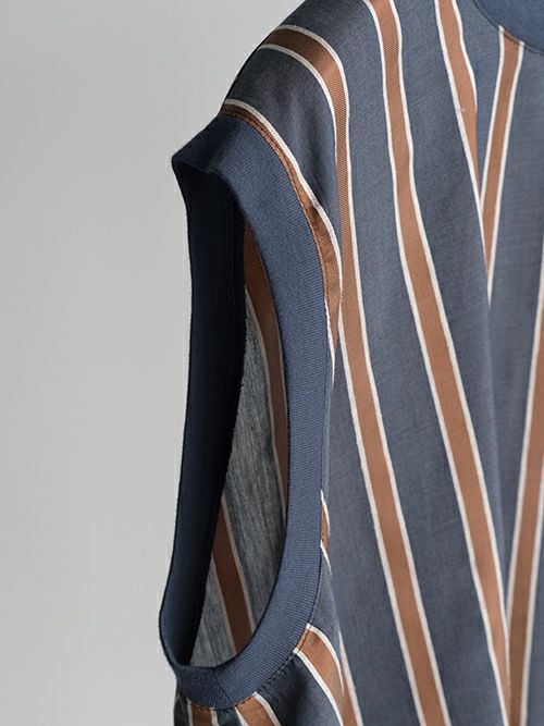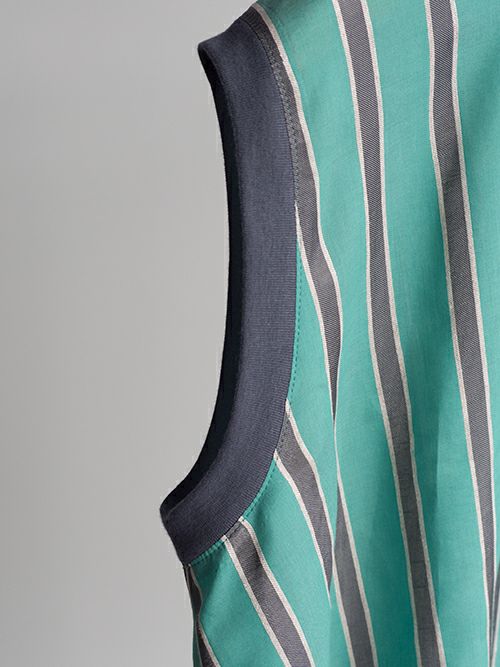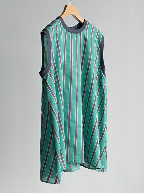 変化のある爽やかなストライプ柄がシーズンムードを高めてくれるノースリーブブラウス。裾にかけて広がるフレアシルエットで、生地にハリと程よいコシ感があり、ヒップにかかる丈なので一枚でも安心して着用出来ます。背面はハーフジップでカジュアルすぎない印象に。