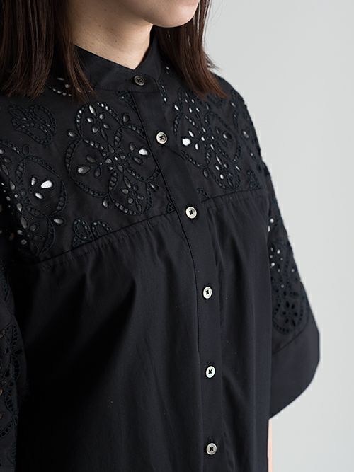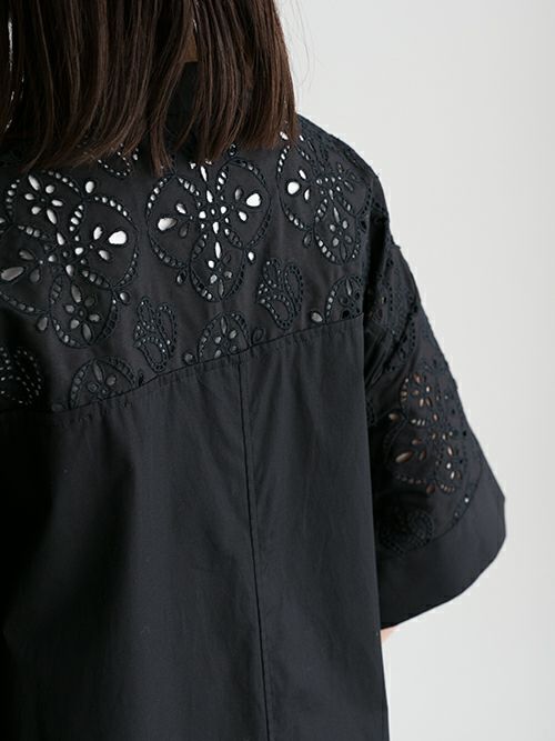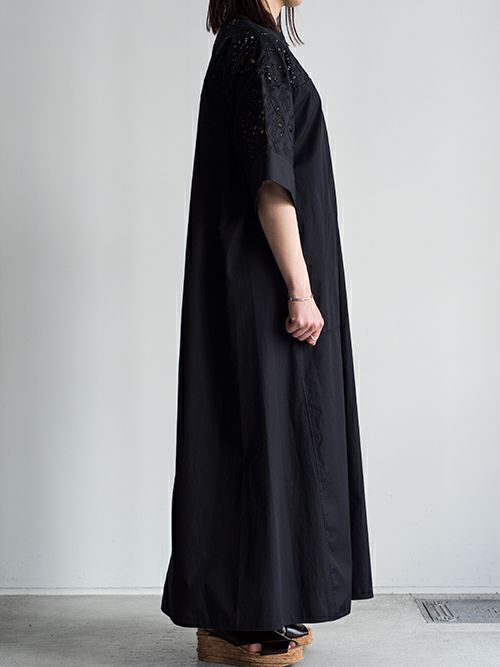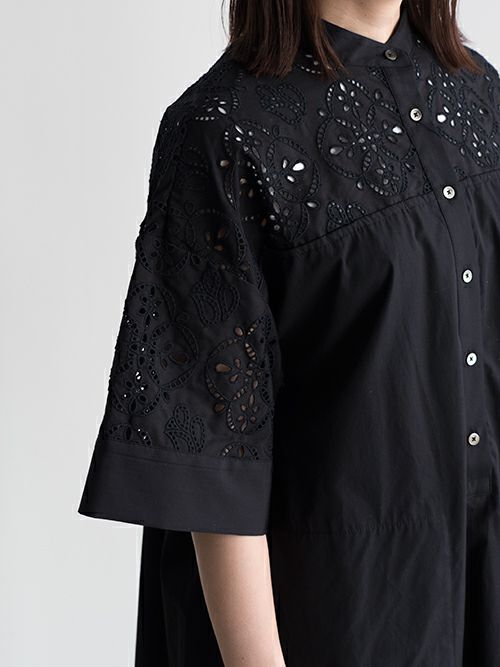 バンドカラー半袖レースシャツワンピース。ショルダーと前後ヨークにレースをあしらったロングシャツワンピース。素材はハリのあるコットンですがポプリン素材でほどよいツヤと光沢があり上品な装いに見せてくれます。