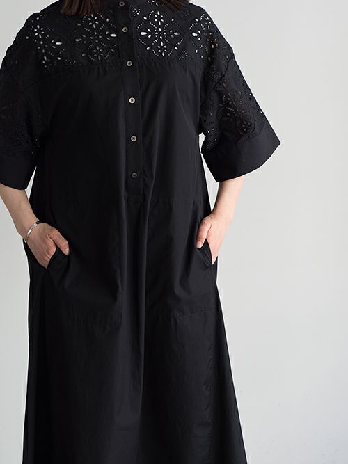 オリジナルレースは国内の産地にて生地に直接刺繍とカッティングの加工を施している。エンブロイダリーレースです。程よいレーシー感が魅力的なワンピースです。