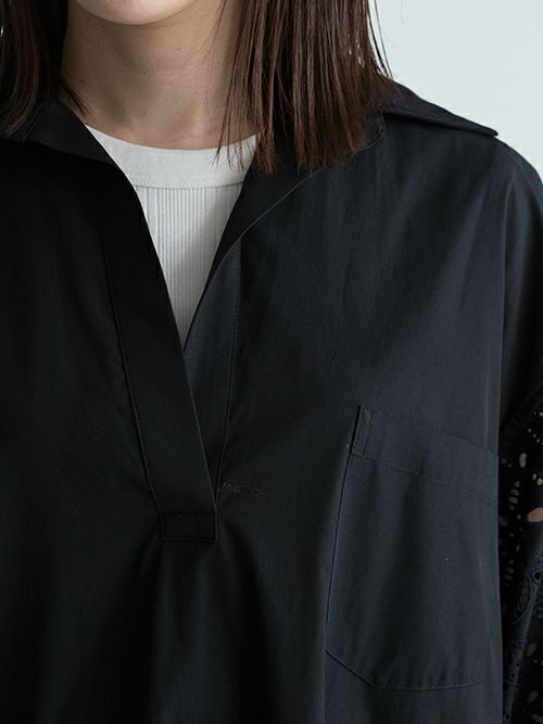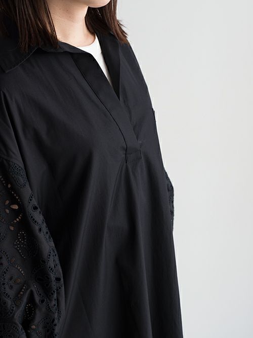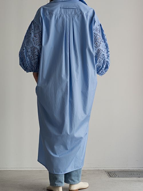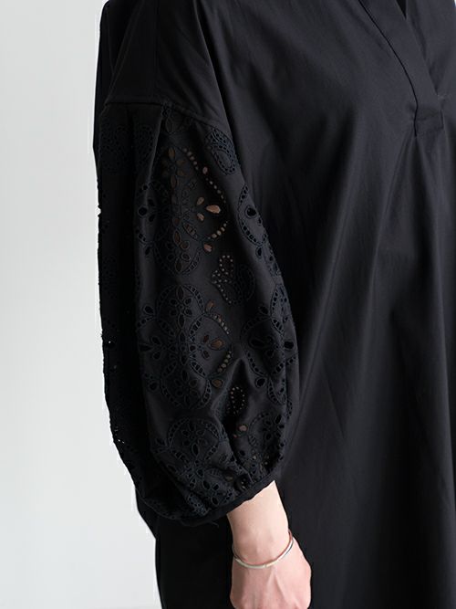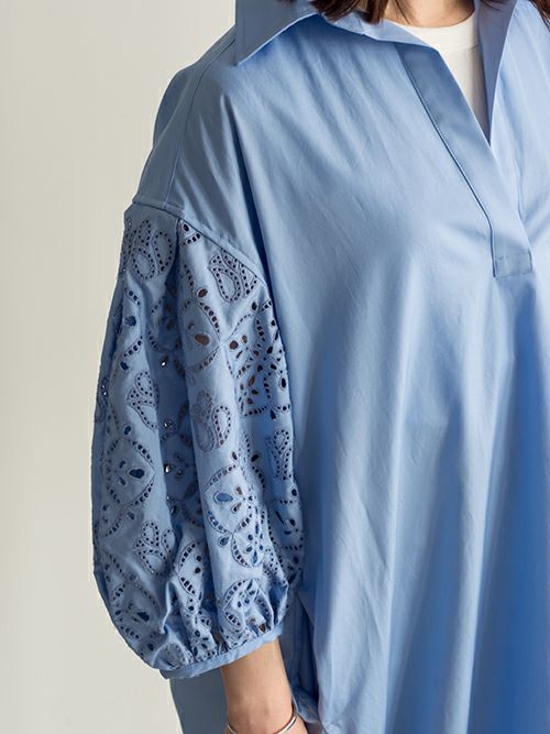 オリジナルの袖のレースは国内の産地にて職人技術により、生地に直接刺繍とカッティングの加工を施しています。